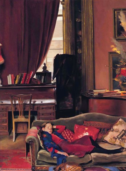 Lucia Heffernan painted this artwork, Little Princess, which presents a whimsical composition dominated by the contrast between the plush red throne and the delicate figure of a rabbit. The artist employs a formal structure that evokes classical portraiture, yet playfully subverts it. The visual elements, such as the gold-framed portraits on the wall and the ornate details of the throne, create a semiotic interplay between royalty and animal representation. The composition destabilizes traditional hierarchies, inviting viewers to question fixed meanings. The artist also uses the cute bunny's royal attire and accessories like her crown to challenge conventional values and engage new ways of thinking about representation. The piece functions as a cultural discourse, prompting ongoing interpretation and re-interpretation.