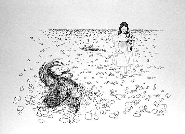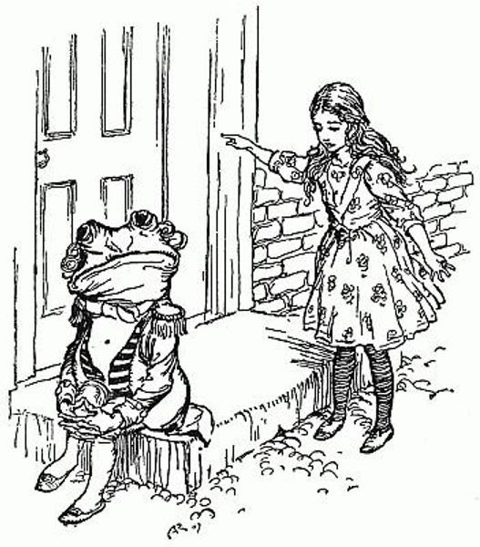 Arthur Rackham made this illustration of a scene from Alice in Wonderland using pen and ink. The medium allows for stark contrasts and fine lines, which Rackham uses to create a whimsical and slightly unsettling atmosphere. The texture is built up through layering of line work, almost like an etching, lending the image a tactile quality despite its simplicity. Note the contrast between the relatively smooth, rounded forms of Alice and the spiky, wiry texture of the mouse. The amount of work here involved in creating this level of detail is quite striking. Rackham was working at a time when illustration was a highly skilled profession, involving not just artistic talent but also technical mastery of reproduction processes. This image, with its careful linework and tonal variation, shows Rackham was deeply engaged with both the artistic and mechanical aspects of his craft.