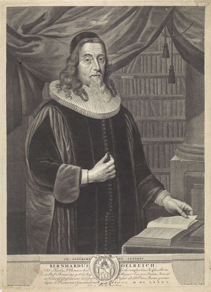 Curator: This engraving, executed sometime between 1688 and 1721, offers a glimpse into the life of Johann Andreas Quenstedt. It is signed by Christian Romstet. Editor: Oh, he looks serious. Stern, almost. Like he's seen things… maybe too many theological debates. It has a brooding, intense quality, even within the precision of an engraving. Curator: The composition is quite formal. Quenstedt is depicted with a book, likely a theological text, which signifies his intellectual and spiritual authority. The artist has used intricate lines to create a sense of texture, particularly in the subject’s robes and hair. Editor: It’s almost gothic with all of its starkness. Look at his hands – they're so delicately rendered, especially as one is resting on the holy book he’s clutching. The overall impression for me is powerful. Curator: Consider also the Baroque elements—the dramatic lighting, although subtle here, and the overall sense of gravitas typical of portraiture from that era. Editor: You can almost feel the weight of the book. I find myself wondering, what kind of person chooses that life of dedication and unwavering purpose? It makes one want to reevaluate choices. Curator: Indeed, this artwork acts as both a historical document and a meditation on scholarly dedication, reflecting both Baroque ideals and perhaps an introspection within the sitter himself. Editor: The play of light on the paper alone invites the eye in, and now my imagination's taking hold! What I see goes beyond ink on parchment. Fascinating.
