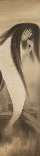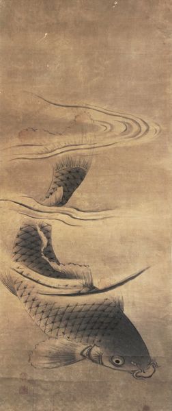 Katsushika Hokusai created this *Snowy Landscape* scroll painting using ink and color on silk. The work is dominated by horizontal bands of creamy brown hues, creating a sense of stillness and serene balance. Hokusai masterfully uses color and line to depict a snow-covered landscape, where forms are simplified to their essential elements. Note the bare trees, and sharply rendered rocks, contrasting with the soft, rounded forms of the snow-laden hills. This interplay of sharp and soft, dark and light, establishes a visual rhythm across the picture plane. The composition reflects an interest in structural organization; each element contributes to a holistic design that seems to suggest an underlying order in nature. The subdued palette and elegant lines invite us to contemplate the silence and solitude of the winter landscape. The painting’s enduring appeal lies in its capacity to offer new aesthetic and philosophical insights.