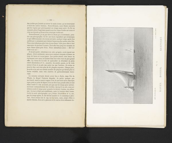 Editor: Here we have “Zeilschip,” a print by A.J. West, made before 1887. It depicts a sailboat, with its sails prominently displayed, reproduced on what appears to be aged paper. It has a serene, almost melancholy mood. What do you see in this piece? Curator: Beyond the obvious nautical scene, I see a commentary on power, mobility, and access. Sailing, historically, has been tied to exploration, colonization, and trade – often with profound social and ecological consequences. Who controls the ship, and where is it going? Consider, too, the material conditions of this print – the aged paper itself speaks to issues of preservation, archives, and whose stories are told versus those erased. Editor: That’s a perspective I hadn't considered. The composition seems so simple, almost idyllic. Curator: And whose idyll is it? Is it the sailor's? The shipowner's? Or is this image meant for a landlocked viewer, perhaps romanticizing a life at sea while remaining detached from its harsh realities? Consider the phrase included in the picture “Queen Mab apres l'abordage,” after boarding. Boarding to where? It all asks the question of narrative framing and how dominant historical perspectives often obscure marginalized voices. Editor: So, you’re saying it’s important to look beyond the surface beauty and question the underlying power structures represented? Curator: Precisely. Art often operates within a complex web of social, political, and economic forces, intentionally or not. Analyzing this etching necessitates considering it not in isolation, but as a cultural artifact embedded in a specific historical context. Who created it, for whom and what purpose. What’s represented, and, more importantly, what is repressed? Editor: I learned so much. Looking at this seemingly simple image, it reveals that one needs to look into the many voices connected with power and history. Curator: Absolutely. It highlights how even seemingly straightforward images can reveal profound insights when examined through an intersectional lens.