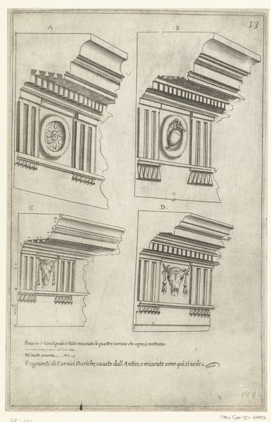 Curator: Here we have "Seventeen Tuscan and Doric Capitals," a print dating back to 1636. The anonymous artist meticulously rendered these architectural details, showcasing a variety of classical column tops. Editor: Well, right off the bat, it feels… austere. It's almost clinical, this orderly arrangement of forms. Very black and white, literally and figuratively. What were these prints meant for, exactly? Curator: Architectural pattern books, mostly. A craftsman or builder could consult these to ensure proper classical details in their designs. They democratized the knowledge of classical forms, spreading a certain visual language across Europe and beyond. Think of them as proto-IKEA instructions, but for grand palazzos! Editor: Ha! Okay, I see that. So, it's about the distribution of knowledge, of making these "high-art" elements accessible, almost mass-producible. It brings up interesting questions about skill—how much craft is *really* needed when you have such explicit guides? Did this shift in production change perceptions of labor and value? Curator: That's a fantastic question! There's definitely a tension between the highly skilled artisan and the more general builder who relies on these visual aids. But consider the original production itself— the copper plate engraving to transfer the image! A fascinating interplay of mechanical reproduction and the human touch. And look closely at each capital— they are the same but somehow different from one another—a dance of pure geometry. Editor: And what about the material reality of it? It’s paper and ink now, consumed, collected. We should really reflect on the source of both; consider that textiles were historically traded for paper, as well as the socio-economic realities impacting ink recipes and dye use. It all ties in! Curator: Fascinating. Seeing them arrayed together this way— divorced from their intended monumental scale— it gives me a different perspective of these grand motifs as artistic abstractions. A study on architectural shape itself! Editor: Indeed! It reveals how “dissemination” also has inherent implications involving social labor, mass production, and value judgments. Thank you for that vision. Curator: Thank you. It gives an intimate connection to history when you know the many sources connected to the work!