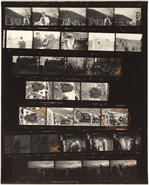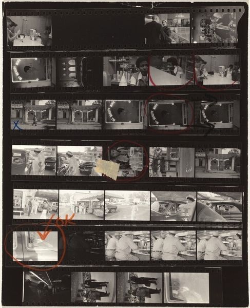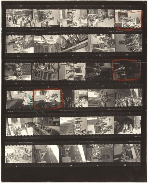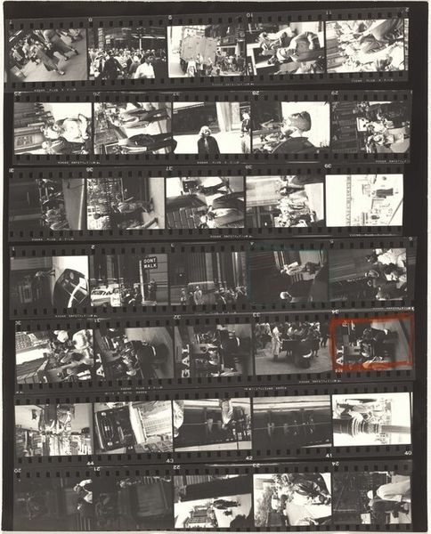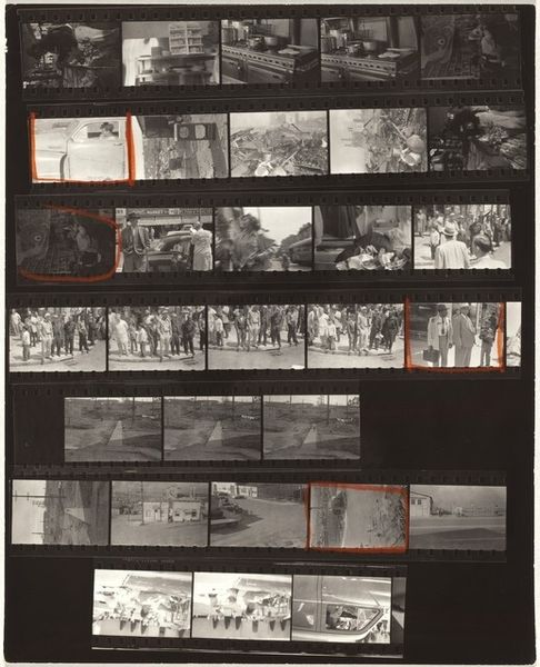Curator: We're looking at Robert Frank's "Mombasa and Nairobi--Africa 6" from 1964, a gelatin silver contact print. It's a collection of images, presented as a film strip. Editor: It hits you right away, doesn’t it? Fragmented, immediate, almost like a raw data dump of impressions. There’s a visual rhythm even in its roughness. Curator: Exactly. The materiality speaks volumes – the physical act of pressing the negative onto the paper. We're seeing Frank’s selection process, the literal contact between the world and the print. It is a post-impressionist photo. Editor: Absolutely. Look at the people in those earlier frames, draped in white. There's a pervasive symbolism there – purity, perhaps innocence. Juxtapose that with the frames showing destruction; piles of rubble. Curator: Interesting point. Consider also how those seemingly candid moments capture street life but, are deliberately composed using the available materials to develop different shapes of human presence: different ages and gestures on a gelatin backdrop, making them available to multiple contexts. Editor: I see the frame with a clock face staring back at us too. And doors closed with grids on them. Time and transition are at play. What is it telling us? Colonialism ending and some different era in front of the colonized persons. Curator: Right! It's that tension between permanence and transience which is very powerful. Frank's working process – his methods of material experimentation – create these layered narratives of change using physical tools. Editor: Thinking of the closed doors I cannot stop thinking about all those icons locked and sealed with a cross. Is Frank drawing a parallel here? Maybe not fully but there's the start of something. Curator: Fascinating! To see such powerful reflections emerging from his specific manipulation of material and social experience. He gives us a vision that lingers long after we move on. Editor: Absolutely. Frank leaves us pondering these snapshots from daily life—not just for their inherent meanings, but for how those images affect one another over time. A rich narrative indeed.