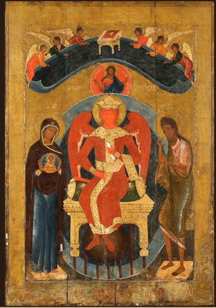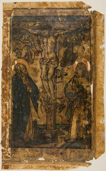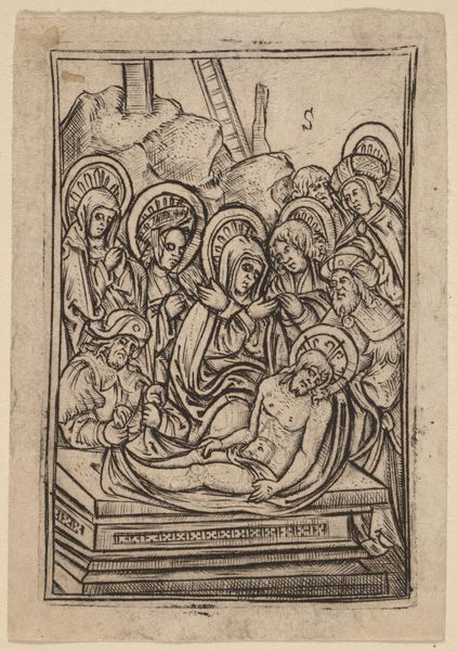 Editor: Here we have "Pentecost from a set of The Passion," a textile piece made with pen and sculpture, dating back to 1592 by Hans Schäufelein. I am immediately struck by its texture and density, as the number of figures creates a feeling of significant weight and symbolism. How would you interpret this piece? Curator: The 'Pentecost' is rich with symbolic meaning rooted deeply in religious iconography. The descending dove represents the Holy Spirit, an image immediately recognizable in Christian art. The gathering of the Apostles, halos aglow, signifies unity and the divine gift of tongues. Notice the inscription, how the written word emphasizes the weight of the image by calling attention to “The Sending of the Holy Spirit". How does it make you reflect on the visual construction as well as how you understand historical storytelling? Editor: So, the artist seems to be less concerned with realistic representation and more focused on communicating symbolic truths about faith? Curator: Precisely. The textile medium itself would also be imbued with significance. In the late 16th century, tapestries weren't just decoration. They proclaimed wealth, piety and cultural refinement. It’s interesting to remember the original function as decoration as you note how the figures contribute to its “density”. The tapestry might invite meditation. Do you feel like it helps one see cultural memory manifest materially? Editor: It does, especially in understanding the visual language that connected faith and status during the Renaissance. Curator: I concur; analyzing such art clarifies how cultural and religious narratives intersect and how artistic interpretation reflects societal values. What I learned today about tapestries helps further illustrate those truths and it further expands the complexity of symbolism beyond paintings.