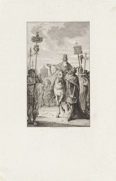 Curator: Welcome. Here we have “Alliantie met Frankrijk, 1792,” or "Alliance with France, 1792," a print currently held here at the Rijksmuseum. Editor: My first impression is how neat and organized the lines are. The classical elements lend the piece an air of somber diplomacy, but there is warmth conveyed in the figures in the center embracing. Curator: Exactly. It depicts the union between the Netherlands and France against their common enemy, Great Britain, during the Batavian Revolution. Its classicism served a very clear propaganda function. The central figures mimic gestures that reach back to antiquity to convey legitimacy. Editor: You can certainly feel the intention behind it. It’s a fascinating look at how the politics of imagery played out then. Tell me more about that function. Curator: Certainly. Note the figures around the pillar with raised arms. They acknowledge and support the bond. The pillar itself symbolizes permanence and authority, inscribed with the promises of alliance. The almost theatrical arrangement invites the public to witness and validate the historical agreement. Editor: It's also interesting to think about who this "public" really was. Surely not everyone shared in this enthusiasm, or perhaps understood the promises equally. Who was left out of this carefully constructed visual narrative? Curator: Indeed, there’s always a tension between intended message and audience reception. The style of classicism itself may have excluded those unfamiliar with its conventions. And, the print was made for distribution within a certain political class. It would also be used to promote a unified cause across various communities and factions, especially among supporters of the Batavian Revolution. Editor: It strikes me how such an apparently formal piece can reveal such intense power struggles and political maneuvering that impacted real people’s lives. Curator: Precisely! That's what makes analyzing art like this so relevant to understanding history, beyond just aesthetic appeal. Editor: It's a stark reminder that images, even those that seem distant or purely historical, carry encoded intentions. Curator: I’ll certainly think more critically about how alliances are visually constructed in contemporary settings, next time.