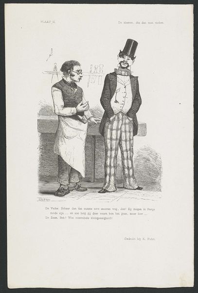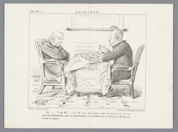 This is a political cartoon by Johan Michaël Schmidt Crans, created in 1886, using an unknown medium. In this image, we see Bismarck, the German Chancellor, depicted as a prince, being presented with a bill after a ‘salmon treaty’ meal. The Dutch Minister Heemskerk stands beside him, suggesting the Prince pay by setting aside the literal treaty. The cartoon reflects the complex relationship between the Netherlands and Germany, where economic and political interests were often negotiated through symbolic gestures and agreements. The setting in a restaurant, a space of consumption and transaction, highlights how these negotiations often came down to material concerns. This work encourages us to reflect on the performative aspects of diplomacy and the underlying tensions between nations.