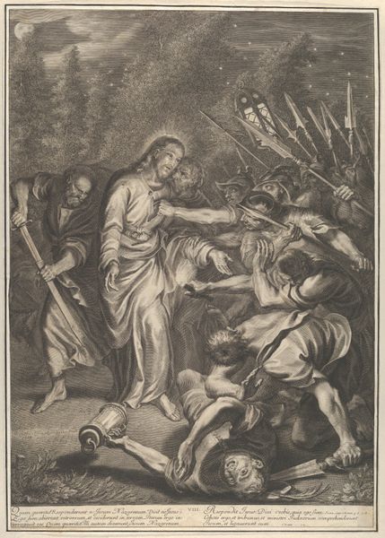 Editor: Salvator Rosa's print, "Saul Consults Samuel After the Witch of Endor Has Conjured", depicts a rather eerie scene. I'm immediately struck by the swirling chaos of the spirits summoned, juxtaposed with the relative stillness of Saul and Samuel. How do you interpret the stark contrast in this piece? Curator: Well, first, doesn't this make you feel as though we’re peeking into a nightmare? I always get the shivers looking at this! The way Rosa captures the biblical story… you almost feel the forbidden thrill Saul must have felt, desperation overriding his good sense. Look how he renders the figures - Saul so rigid in his desperation, Samuel an apparition swathed in cloth; versus the active pose of the witch as she's evoking the magic from Samuel. But tell me, what does this all make you *feel*? What ghosts does it conjure from *your* history? Editor: Ghosts from my history... I suppose the idea of seeking answers in forbidden places resonates. It feels timeless. Curator: Exactly! The print breathes a life that transcends the subject. It captures a universal human desire – to know what the future holds, even when we suspect the knowledge might destroy us. Consider the composition: everything leads your eye towards the central, spectral figures. Rosa is practically conducting a sinister symphony for our senses. Does this add a fresh insight, change anything for you? Editor: Absolutely! I was so focused on the literal narrative that I missed the emotional current flowing through it. Thank you for highlighting that. Curator: It’s art’s greatest trick, isn’t it? Disguising profound feeling as mere story. It makes me see everything a little differently now, too. Thanks for pointing me in that direction.