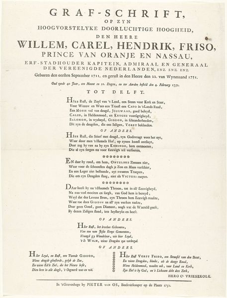 Curator: This print, created around 1780 by G. Bom, bears the title "Tekst bij het ruiterportret van Willem V, prins van Oranje-Nassau." Editor: My first impression is that the print is striking in its design, despite its age. The letterforms create texture, almost like fabric. There is something both classic and dynamic about it. Curator: Absolutely. The text isn't just informational. This piece embodies the late 18th-century Dutch cultural landscape, saturated with notions of national identity and princely leadership. We see the stylized text and heroic language. Consider the context of its creation, with Willem V struggling to maintain power amidst growing political instability. This work clearly aims to reinforce his image. Editor: I am interested in how the print employs symmetry to underscore these very themes of stability and authority you address. The deliberate arrangement of the lines, the balanced weight of the typeface; everything serves to visually represent an order that the text describes. Even with all the S-curves that add ornamentation, there's a structural rigor to the lettering itself. Curator: Yes, and this is meant for public consumption. The print operates as a piece of propaganda designed to associate Willem V with military might and historic legacy. It also suggests an implied continuity of leadership through the allusions to earlier prominent leaders. How effective this messaging actually was at that particular point in history is highly debatable given the rise in Patriot sentiment against the Stadtholder. Editor: I agree. You are directing me towards something interesting there, the potential friction between this work as a celebration of form and its aim as effective social commentary. To what degree did the rigid and perhaps slightly old-fashioned presentation resonate versus becoming another symbol of establishment power? Curator: I’d argue the deliberate embrace of established, even nostalgic, typefaces and textual structure plays a significant role. It is less about genuine dialogue or persuasion and more about reinforcing the status quo through recognizable symbols and language. This kind of art piece should prompt critical discussion about its socio-political effect then and now. Editor: These closing comments remind me that even an exploration of such fine-grained material properties can bring out salient points about broader cultural factors and motivations. Curator: Precisely; seeing beyond the artistry uncovers layers of historical dialogue that both reflect and actively construct social reality.
