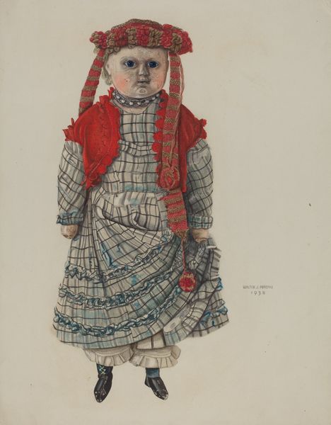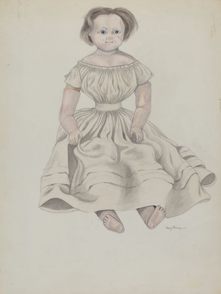 Edna Rex’s ‘Wax Doll’ appears to be an intimate, intuitive watercolour of a cherished object, made on paper at an unknown date. The muted palette and the doll’s slightly melancholic expression give the work a wistful, dreamlike quality. Look at how Rex handles the fabric of the dress – the sheer variety of blues and purples suggesting depth and movement. The doll's face, with its simple, almost childlike features, is rendered in warm browns and yellows. This contrast between the doll's rigid features and the fluid, flowing lines of the dress adds an emotional complexity. The way Rex captures light is also very subtle. See how she uses thin washes of colour to create shadows and highlights, lending the doll a sense of volume. This focus on light and colour reminds me of the early work of Fairfield Porter, who also had a knack for finding beauty in the everyday. Like Porter, Rex seems less interested in technical perfection, and more in capturing the essence of her subject, which is the feeling of seeing and representing an object.