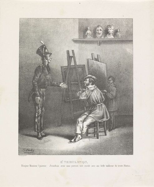 The Van Lier Brothers created this print titled "De Scheerder / Le barbier." The composition divides the scene into distinct zones, each contributing to the narrative's clarity. The barber stands on the left, adorned in a green jacket and purple trousers, while the seated customer occupies the center, wrapped in a simple white cloth. The scene's structure, from the barber's poised stance to the customer's slightly contorted expression, directs our gaze and shapes our interpretation. The interplay of vertical and horizontal lines creates a sense of depth. The verticality of the figures is contrasted by the horizontality of the bed in the background, and the composition allows for a semiotic analysis of the social dynamics portrayed, with color possibly symbolizing status and profession. Ultimately, the print invites contemplation on how visual elements like color, composition, and line intersect with cultural narratives about class and social roles.