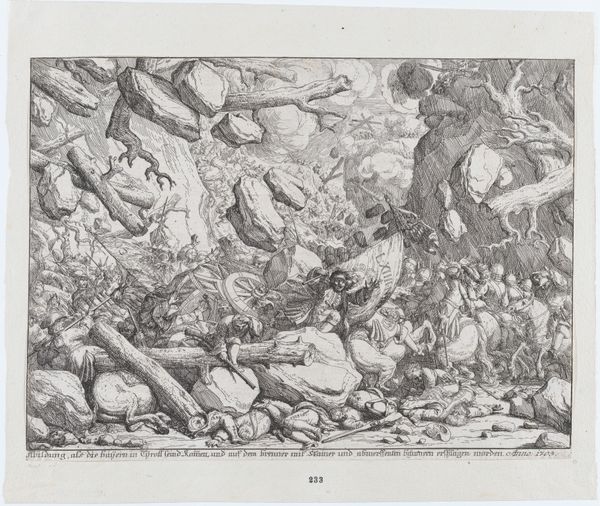 Curator: This pen and ink drawing captures a rather dramatic moment in history, depicting "Maria van Bourgondië valt van haar paard, 1482" or "Mary of Burgundy falling from her horse, 1482." The piece, made sometime between 1800 and 1846, is attributed to Henri Van der Haert. What are your initial impressions? Editor: Total chaos! That's my first thought. It's a flurry of frantic lines, all leading my eye to that central figure, tumbling dramatically from her horse. You can almost feel the ground rushing up to meet her. There’s something so unsettlingly energetic about the scene. Curator: The drawing style really amplifies that sense of chaos, doesn't it? Van der Haert employs incredibly fine, almost frantic lines to depict the scene. Consider this work through the lens of Romanticism, we can view how Van der Haert portrays heightened emotion and the power of nature to shape individual destiny, diverging from the strict neoclassical style that came before. Editor: Absolutely, it screams Romanticism! Forget those staid portraits of poised nobility. This is real drama, raw and full of pathos. I love how he's used the ink to create depth and movement. Even those dark, spidery trees seem to be reaching down as if they are foreboding a tragedy about to occur. Did she survive this fall? Curator: Sadly, no. This event ultimately led to Mary's death, marking a significant political turning point. The lack of an heir created considerable disruption, a power vacuum felt across Europe. Van der Haert seems conscious of depicting not just a fall but the unraveling of dynastic stability. The museum presents the image as an early work in political communications in some senses, capturing public attention through emotion. Editor: The more I look at it, the more I sense a profound sadness. It is not just her personal tragedy—I guess that is a poignant representation of a fleeting power and the unpredictable nature of fate, no matter how privileged you are. Thank you for the additional contexts. I did not pick on that before. Curator: Of course. Art invites constant reflection; our understandings of this particular tragedy only add weight to the delicate strokes captured. Editor: A fascinating look at fate through ink and paper, that reminds us how art really bridges those emotional historical moments. Curator: Precisely; these moments bind our stories, so very often shaped through the simplest line of inquiry and human desire to express it.