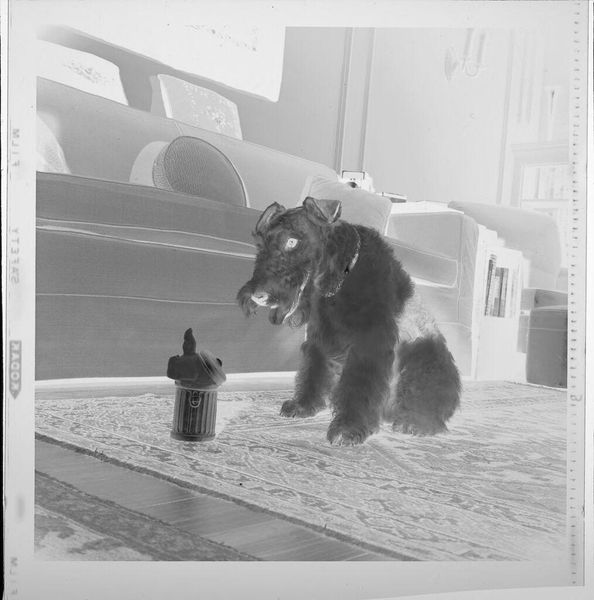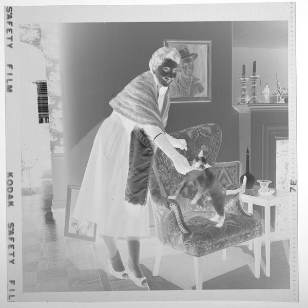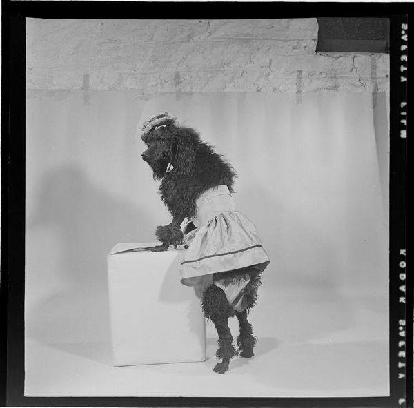 Curator: Here we have an untitled photograph by Jack Gould, portraying a dog dressed in a skirt and hat. Editor: Immediately, the stark contrast and the dog's posture convey a strange, unsettling elegance. Curator: Considering the era this was likely created, it's tempting to read it as a commentary on societal expectations and the performative nature of identity. Editor: The composition is deceptively simple, yet the interplay of light and shadow sculpts the dog's form, highlighting the textures of fur and fabric. Curator: Indeed. Is the artist hinting at the absurdity of imposing human constructs on animals, and by extension, on marginalized groups? Editor: Perhaps, but the formal arrangement suggests a deliberate construction of meaning through visual elements alone. Look at the sharp lines against the soft fur. Curator: I find this image to be a curious reflection of power dynamics and representation. Editor: And I appreciate its subtle manipulation of form to evoke a specific mood, regardless of overt symbolism.