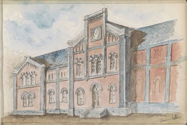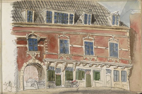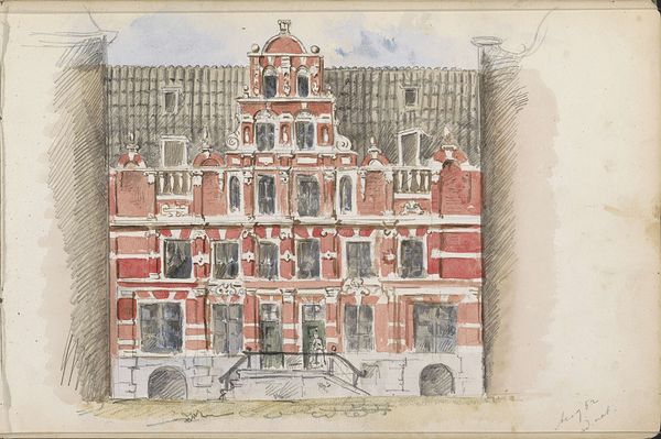 Isaac Gosschalk created this watercolour and pen drawing entitled ‘Seventiende-eeuwse gevel’ showing a seventeenth-century facade. The building, rendered in muted reds, blues and browns, is defined by rectangular shapes and vertical lines, projecting a sense of formal order. Notice the emphasis on architectural detail. The intricate windows and ornate decorations suggest a focus on surface and structure. This attention to detail invites us to consider the interplay between representation and the thing represented. How does Gosschalk use form to create meaning, and how does this relate to our understanding of architectural space? Consider how the drawing reflects a broader cultural interest in the past, and the ways in which artists like Gosschalk engage with and re-interpret historical forms through their work. The drawing captures the essence of the building's historical period while also infusing it with a unique artistic vision. It's a structure of art, of signs, which engages our understanding of architectural space and its cultural significance.