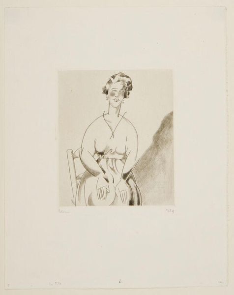 Curator: George Bellows's "Study of Mary" presents a seated woman, rendered in delicate lines. There's a striking melancholic quality to the composition. Editor: Indeed. The sitter's clothing seems to both empower and constrain her; I wonder what role women of her class were expected to fulfill. Curator: The artist's use of etching allows the subject to merge and interact with the surrounding space, which seems to highlight her isolation within the composition. Editor: Looking at the overall composition, the subject seems overwhelmed by the patterned fabrics and textures, hinting at the pressures and expectations placed on women. Curator: It is precisely this interplay of light and shadow, the contrasting textures of the dress against her skin, that evokes such a powerful sense of quiet reflection. Editor: Absolutely, and in this context, we can see how societal expectations can shape a woman's identity, revealing both her confinement and her resilience. Curator: A fascinating piece that invites contemplation on the delicate balance between form and feeling. Editor: Yes, it is a powerful commentary on the experience of womanhood during that era.