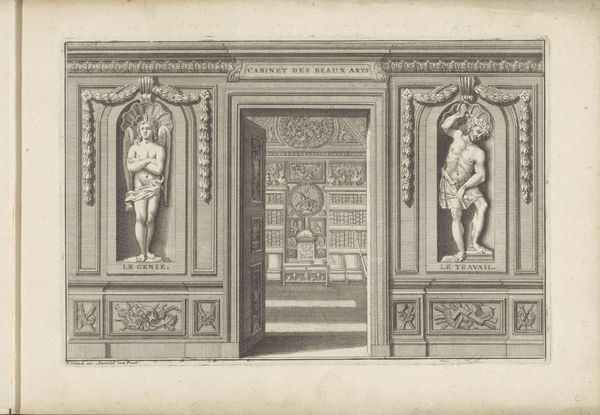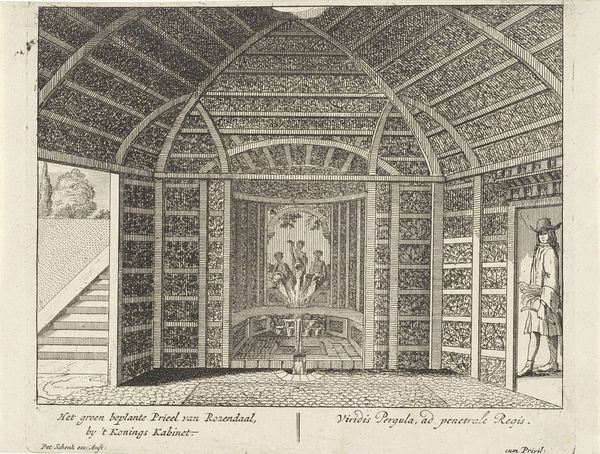 Curator: Today we are looking at “Tsaar Peter de Grote bezoekt het Museum Wildianum,” an ink and pen drawing by Maria de Wilde from around 1697 to 1700. It depicts Tsar Peter the Great's visit to the Wildianum museum. Editor: Wow, it feels so... curated, even within itself! Like looking into a miniature dollhouse, with obsessive detail paid to every little knick-knack on the shelves. The perspective is so pronounced, you almost expect to fall right in. Curator: Indeed. This work engages with the power dynamics inherent in representation and spectatorship, and it must be viewed against the backdrop of shifting European power structures in the late 17th century. Tsar Peter's visit wasn't simply a friendly call; it was a political and cultural negotiation. De Wilde's portrayal positions the museum and, by extension, Dutch knowledge as objects of interest, even perhaps of potential acquisition. Editor: So, it's a power play, framed as a polite viewing? It gives off such a scholarly vibe at first glance, what with all the books and globes. But those neatly organized shelves – the way everything's so precisely displayed... It almost feels sterile, like knowledge put on parade. It kind of reminds me of those perfectly staged Instagram bookshelves, you know? Beauty and order obscuring something more complex. Curator: The museum in this drawing should also be read as an extension of its owner, demonstrating wealth and social standing, especially since Peter the Great went on his so-called Grand Embassy, where he looked to western Europe in the hope of modernizing Russia. Editor: Absolutely! And De Wilde captures that moment of cultural exchange so slyly. Like she’s whispering, "Look closely; there's more than meets the eye here.” I like it even more now that I understand its deeper implications! Curator: Well, it showcases how the intersection of art, history, and political science create dialogue surrounding identity, gender, race, and social issues. Editor: To be honest, it almost feels like I've gone on my own little "Grand Embassy" through Maria's eyes; peering through a portal of meticulous pen strokes. I can’t wait to delve more into works that reveal their hidden dimensions.
