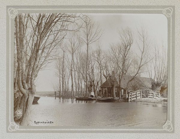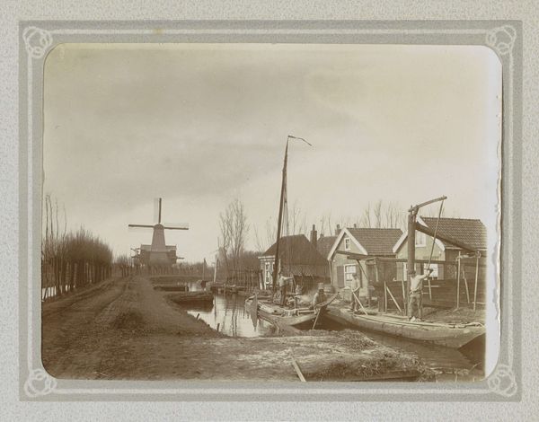 Editor: This photograph, "Huizen, schuren, een brug met twee kinderen en een sloot in Goënga," was taken by Folkert Idzes de Jong around 1905-1907. It's quite a serene landscape. What really catches my eye is the composition; the way the buildings and the water create a mirroring effect. How do you read this image? Curator: As a materialist, I’m immediately drawn to the socio-economic implications embedded within this image. Consider the materials used in the construction of these buildings – wood, thatch. They speak volumes about the available resources and the local labor involved in their construction. What can you infer about the community from their dwellings? Editor: I guess it suggests a reliance on readily available, local materials. Possibly a rural, working-class community, dependent on the waterways? Curator: Precisely. The very act of photographing this scene, rather than painting it, is also a telling choice. Photography was becoming increasingly accessible, yet it still required resources and technical knowledge. This photograph thus provides insight into class and changing production practices. Does the presence of the bridge spark any thoughts? Editor: It implies connection and trade. The fact that it’s a rather simple bridge further speaks to the community's resources. It seems very utilitarian. Curator: Exactly. Even the children on the bridge suggest a social fabric, the next generation integrated into the landscape of production and material life. We can see how materials and class structure create art meaning, a departure from idealized aesthetic experience. Editor: That's a fascinating point of view. I never considered photography itself as a form of material production that provides such rich sociological insights. It really gives a completely different depth to understanding this landscape.