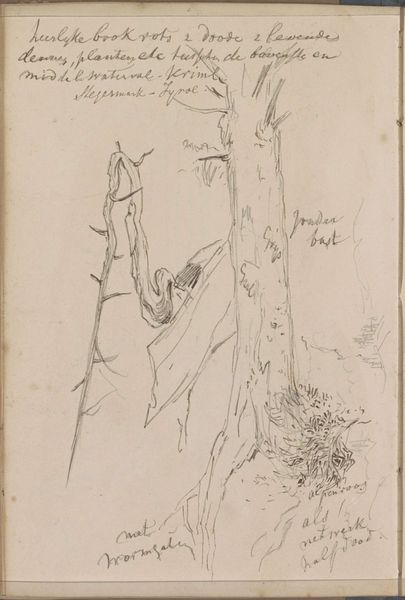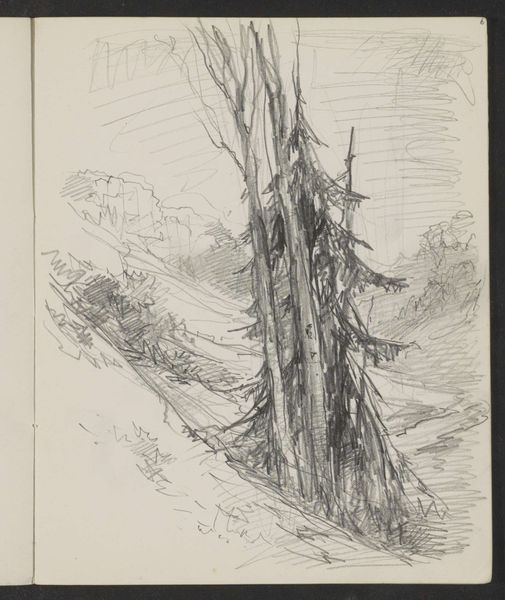Editor: Here we have Johannes Tavenraat’s “Waterval,” potentially from 1858-1859, rendered in pencil and ink. The landscape is gestural, almost fleeting. What symbols or meanings do you see at play here? Curator: A waterfall, particularly in Romantic art, carries tremendous symbolic weight. Consider water itself - often representing the unconscious, the source of life, and a space of constant flux. A waterfall, then, becomes a visual metaphor for the power and sublimity of nature, but also for time's relentless flow, doesn't it? It suggests transformation and erosion simultaneously. Editor: So the image isn't just a scene but a representation of deeper, maybe even opposing, forces? Curator: Precisely. Notice how Tavenraat has sketched fleeting gestures rather than meticulous details. This can echo the artist's own internal state and connection to the subject matter. Is he suggesting a longing for, or perhaps a fear of, nature's power? The surrounding barely-there vegetation can signify vulnerability, our fragile connection to the natural world. Editor: It’s amazing how much information can be communicated through a seemingly simple drawing. I hadn’t thought about the implications of the “unfinished” quality. Curator: Indeed. And what we may deem “unfinished” could instead be interpreted as deeply personal and perhaps even revelatory to Tavenraat's intimate perception. Thank you for opening my eyes as well!