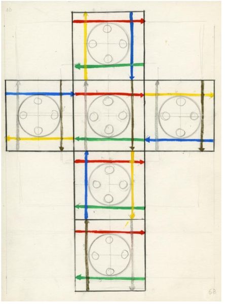 Editor: Here we have Stuart Davis's "Color Theory Diagram," from 1940, housed at the Harvard Art Museums. It's a deceptively simple arrangement of colors, yet it evokes so much. What symbolic weight do you think Davis intended to convey with this particular configuration of colors and lines? Curator: It is tempting to see just a basic color chart, but look at the way those lines both connect and divide the colors. The square, the spokes... don't they remind you of alchemical symbols, diagrams of transformation, ways of understanding not just color, but the relationships *between* things? Editor: I see what you mean! It's not just about primary and secondary colors, it's about their interactions, how they influence each other. Curator: Precisely! Davis wasn't merely illustrating color theory; he was exploring how colors, like people or ideas, exist within a structured, yet dynamic, social framework. What do you make of the date on the piece? Editor: Seeing the date makes it clear he was doing this as a study, probably in preparation for a larger work. I hadn't thought about it being more than a visual aid. Curator: It invites us to reconsider the power of simple diagrams. Thanks to you, I will never look at a color chart the same way again.