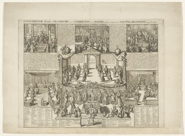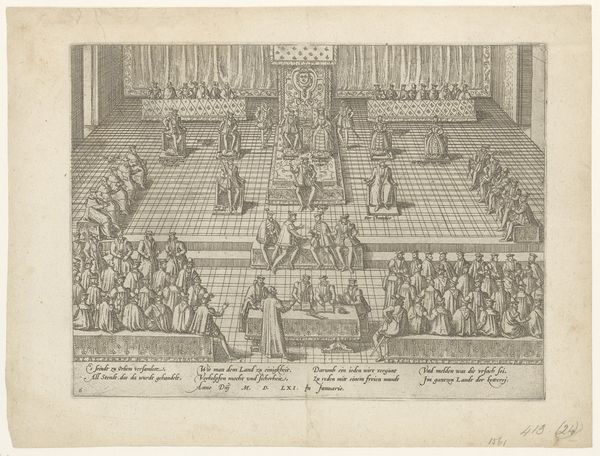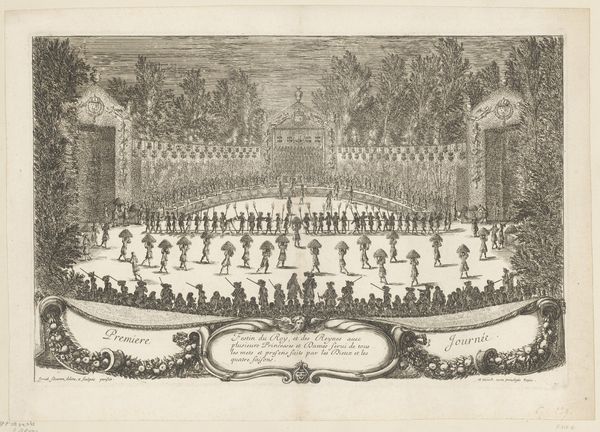 Jean Lepautre made this print of Louis XIV and his entourage at a theater in Versailles using etching and engraving, processes that rely on the manipulation of metal plates. The fine lines and intricate details are achieved through careful incisions into the metal, which then hold ink to create the final image on paper. Notice how the contrast between light and shadow, meticulously rendered through hatching and cross-hatching, gives depth and texture to the scene. This print isn't just a depiction of royalty at leisure; it's a study in the labor-intensive techniques of printmaking, reflecting the skilled craftsmanship valued in Lepautre's time. The choice of printmaking as a medium also suggests broader social implications. Prints were more accessible than paintings, allowing for wider dissemination of images and ideas. In this case, the image of royal spectacle could be distributed to a broader audience, reinforcing the King's power and prestige. It’s a reminder that art, even in its reproductive forms, is deeply embedded in the social and political context of its creation.