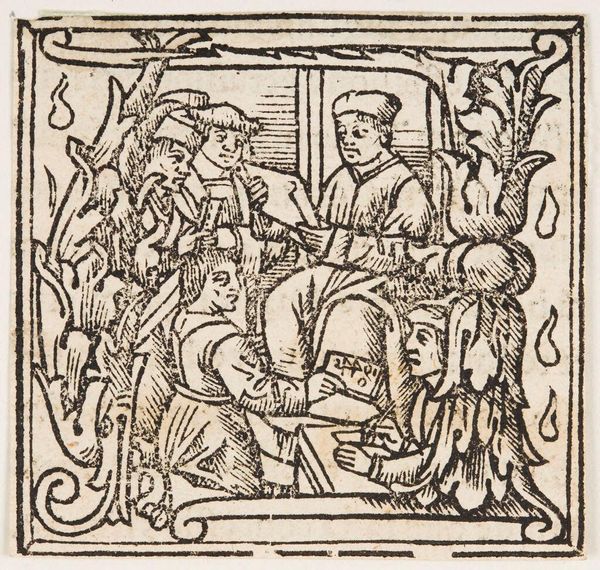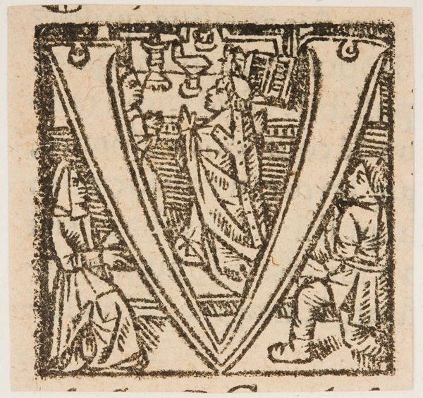 Curator: This small woodcut, "Initials Used in Books Printed by Rembolt and Gering," showcases the letter 'V' filled with surprisingly detailed figures. Editor: It strikes me as both austere and ornate; the stark black lines and the letter’s bold geometry contain a rather busy scene. Curator: Exactly! The anonymous artist and the printers, Rembolt and Gering, would have been concerned with the technical aspects. Consider the cutting of the woodblock to create such a precise, repeatable image. Editor: And the symbolism! Within that V, we see a priest officiating between two figures; above are chalices and texts—resonant symbols of religious ceremony and the power of the written word. Curator: Yes, but consider also the labor involved in printing. This small initial signifies a larger, more complex process of production and distribution of knowledge. Editor: Absolutely. This image gives us a glimpse into the early printing era and the symbolic weight it placed on literacy and the church. Curator: It’s amazing how much information about craft and production can be conveyed in such a compact piece. Editor: Indeed, a tiny vessel carrying powerful cultural currents.
