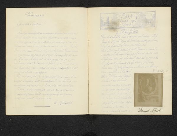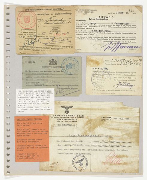 Editor: Here we have "Passport of Wilhelmina Gerarda Hoogendijk," created in 1946. It's a photographic work, an open passport really, and something about the stamps and handwritten details gives it such a unique, tactile feeling. What do you notice about this piece? Curator: What interests me is the passport as a *made* object. It's not just an image; it’s a document created through very specific, bureaucratized processes. The photograph itself, that small portrait, represents a specific transaction – a sitting, the development, printing... All requiring material inputs, photographic paper, chemicals, and labour. Editor: So you see it less as a personal record and more as a product of a system? Curator: Exactly. Consider the passport's purpose: it regulates movement, it defines and limits access, all within a specific political and economic framework. The very materials used to construct the passport reflect a society's resources and its power to control its borders. Editor: That's interesting. I hadn't thought about the materiality implying a larger social structure. Curator: Look at the handwriting, the stamps. Each mark signifies a physical act of inscription and validation within the larger machinery of the state. Who handled this document? What kind of labour went into producing and authenticating it? It forces us to consider not just the image, but the material processes behind identity construction. Editor: It is strange to think about all the invisible processes happening to create the photograph we see! I hadn't thought about the human labor behind this portrait, beyond the subject herself, Wilhelmina. Thanks, this perspective really broadened my understanding. Curator: Mine as well! Considering the means of production truly helps decode the broader contexts of any work of art, even one as seemingly simple as this.