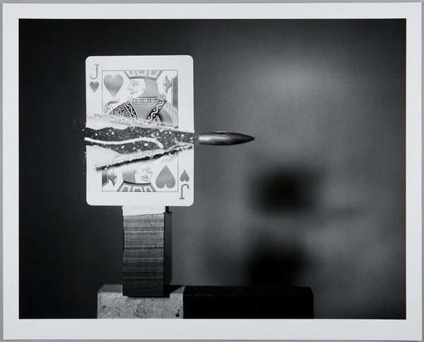 Editor: This is Harold Edgerton’s "Death of a Lightbulb," a photograph that captures a bullet piercing a lightbulb. The stark contrast between light and dark is really striking! What do you see when you look at this piece? Curator: The photograph arrests a fleeting moment, converting the dynamic interaction between the bullet and the bulb into static form. Observe how Edgerton manipulates the medium to render motion visible. Editor: So, it's about the technique more than the subject? Curator: Precisely. The composition itself, the radial burst emanating from the bulb, generates a visual rhythm. Consider the formal relationship between the destructive force and the fragile object. Editor: I see, the moment captured is less important than how it was captured. Thanks! Curator: Indeed. It reveals how formal elements articulate a visual language.