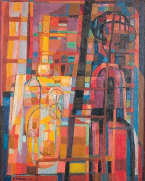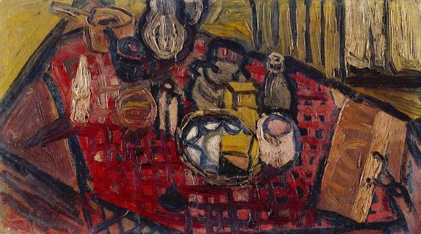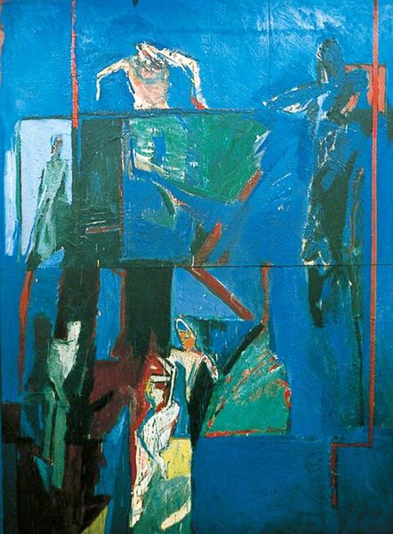 Curator: "Sjømannsenken," or "The Sailor's Widow," painted in 1945 by Jakob Weidemann. It's oil on canvas. It immediately strikes me with a particular gravity and a sense of unresolved grief. Editor: Absolutely. There’s a contained turbulence here. It feels almost like an archaeological dig, layers of sorrow painted over, dug into, rearranged. Does that make any sense? It is so immediate with feelings that feel historical to the touch. Curator: It does. Weidemann's works after the war explore isolation, and I think this painting embodies it with remarkable intensity. See how the figure seems caged within the angular composition? The colors, mostly somber blues and browns, are symbolic, resonating with loss. There is something incredibly vulnerable about it, although that it is hidden away within all those shapes and planes of the abstract impressionist elements. Editor: You’re right. Those blues, especially. It's like peering into a shadowed room where memories cling to the furniture. Yet the white of the dress... almost hopeful? The white against those heavy blues does bring me somewhere with this figure, the woman portrayed in her isolation and her role in the history of this grief and moment, and era. Curator: The "Widow" figure is a recurring motif throughout history. It represents a liminal space, existing between the known world and the unseen. This archetype appears across different cultures; she embodies not only individual sorrow but communal mourning. Editor: Yes, that visual language really transcends specifics. Though the painting seems to depict a lone figure, the emotional resonance widens out, hinting at the shared experience of loss and endurance of a whole era. What seems simple about her at first glance really blossoms outward when she becomes about much more. Curator: I've always been moved by the artist's choice not to resolve the image fully. It creates a kind of open wound, demanding empathy from the viewer. Editor: An open wound is a powerful description. I’d say, too, it's almost hopeful. It leaves space for healing, or at least the beginning of some understanding, within us. Thanks for showing me that—I never thought of it that way before!
