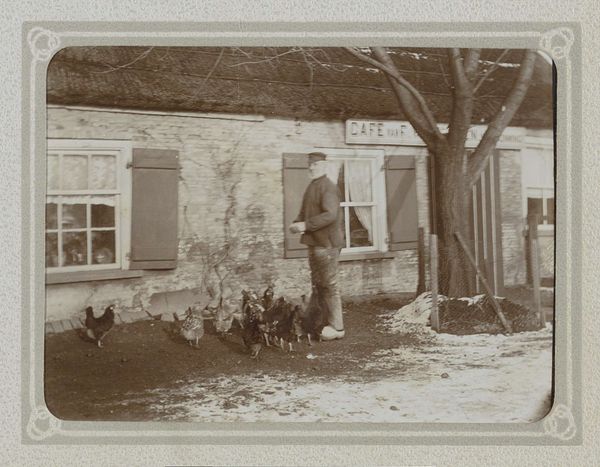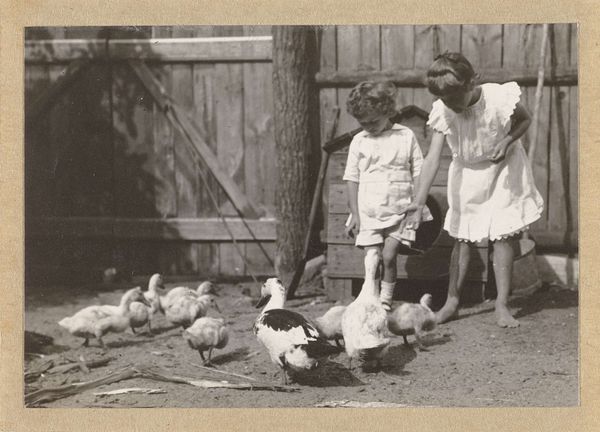 Curator: Before us, we have a gelatin silver print from sometime between 1900 and 1930. It's titled "Kuikens in een hok," which translates to "Chicks in a Coop," attributed to Richard Tepe and is currently held at the Rijksmuseum. What strikes you about this work? Editor: It’s claustrophobic. The deep shadows coupled with the sheer number of chicks huddled together evoke a feeling of confinement. Curator: Yes, and Tepe's choice of capturing this scene from a low angle heightens that sense of enclosure. But beyond the immediate feeling, the coop becomes symbolic. For me it suggests our limited scope of existence within constructed environments, a sense that resonates through centuries of art where humans are confined indoors. Editor: The strong contrast further intensifies this effect. The window, though small, is the single source of light, slicing through the darkness and drawing the eye immediately to the outside world. It’s an almost Baroque use of chiaroscuro, directing the viewer's gaze, despite its seemingly mundane subject matter. Curator: It brings to mind ideas of the human connection with the natural world that transcends centuries. Remember still-life paintings depicting domestic life from the Dutch Golden Age? Here, chicks in a coop fulfill this long-held vision. This continues cultural memory through a photograph. The symbolism is rich for an object so understated. Editor: And understated is indeed how the beauty lies. The texture is incredible. Look at the soft fuzziness of the chicks against the rough, uneven ground of the coop floor. Even the slightly out-of-focus background lends a hazy dreaminess to the photograph, separating it from the realism of the foreground. Curator: A blend of intimacy and separation. In these photographs, as elsewhere in visual history, enclosed spaces have functioned as potent symbols to remind viewers about something larger outside their own lives. Editor: Indeed. From a formal perspective, it really plays with the tension between realism and a more painterly, expressive mode. The seemingly haphazard composition is remarkably well-balanced. Curator: Tepe used symbolism to invite contemplation of themes we confront even today, even though the work portrays a modest farmyard scene. Editor: And on close viewing, it shows us that beauty exists, surprisingly and affectingly, within confinement.