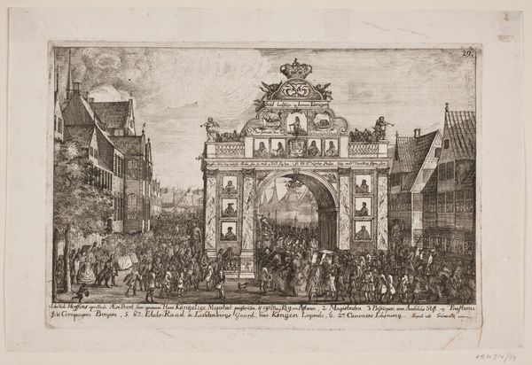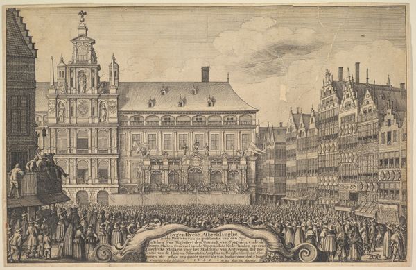 Editor: This engraving, titled "Afkondiging van de Vrede van Munster te Antwerpen, 1648," or "Proclamation of the Peace of Munster in Antwerp, 1648," was created anonymously sometime between 1648 and 1650. The sheer detail of the cityscape and the masses of people is striking. What aspects of its composition stand out to you? Curator: The systematic arrangement of pictorial space is particularly noteworthy. Consider how the anonymous engraver uses linear perspective to create depth. Notice how orthogonals converge towards a vanishing point, guiding the eye from the foreground figures to the architectural backdrop. How does the density of lines and their directional changes affect your reading of space within the work? Editor: I see what you mean; the lines become denser higher up, giving the impression of distance and also heightens the drama of the central building. Is there significance in the building’s structure itself? Curator: Certainly. Observe how the architecture is segmented. Note the progression of planes and their ornamentation. The interplay of light and shadow accentuates the geometric clarity of the structure, and the clear arrangement underscores the architectural grandeur. It becomes a key compositional tool and an exploration of spatial organization in itself, don't you think? Editor: That’s an interesting perspective; I was initially drawn to the event portrayed. Now, looking again, the emphasis seems to be not on the peace itself but on the calculated precision with which it's visually represented. Thank you for pointing out these details. Curator: Indeed. Understanding formal properties enables us to unravel the artist's intentions beyond the immediately obvious. Considering elements such as line, space, and organization refines our aesthetic understanding.