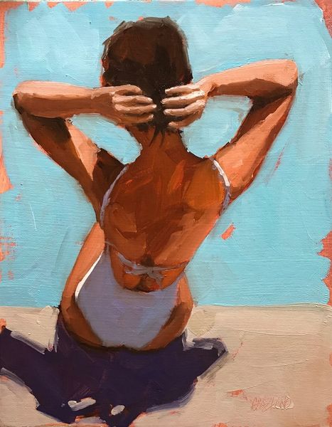Dan Graziano created this painting, "Oceanfront View," using broad brushstrokes to capture a figure against a vibrant blue backdrop. The bold strokes of orange that define the figure and bleed onto the edges create a dynamic tension with the cool blues. Consider how Graziano uses the materiality of paint. The visible brushstrokes and textural variations aren't just representational, but act as signs of the artist’s process and material engagement. This emphasis on the medium destabilizes traditional notions of painting as merely a window onto reality. Instead, the artwork becomes a self-referential object, drawing attention to its constructed nature. The color palette further enhances this effect; the oranges, while suggesting warmth, are applied with a vigor that abstracts the scene, pushing it towards a semiotic representation of form rather than a mimetic portrayal. This painting stands as a testament to art's capacity to challenge our perceptions and invite ongoing interpretations.