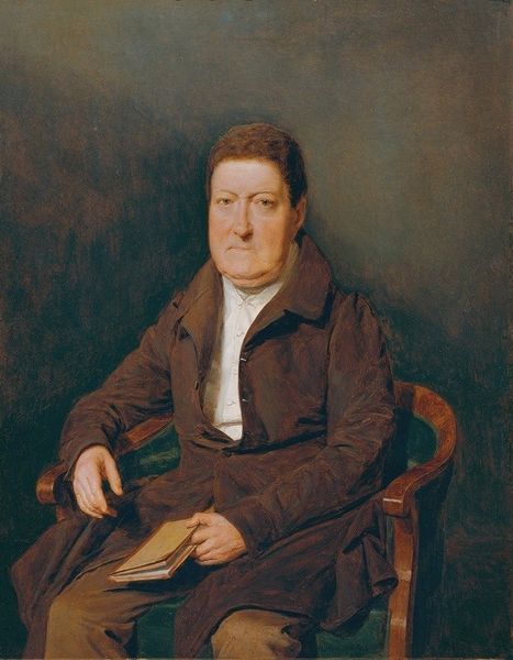 Curator: Here we have William Powell Frith’s “Self-Portrait at the Age of 83”. Editor: The darkness almost swallows him. There’s this pale face and wisps of white hair emerging from a sea of dark colors. Quite striking! Curator: Frith was a very successful artist known for his detailed genre scenes depicting modern life in Victorian England. Think "Derby Day". A self-portrait at this stage is interesting given his career success; it’s a personal statement about aging and legacy. Editor: True, but look at the brushwork—the looseness in the coat contrasting with the sharper focus on the face. The face itself is a play of light and shadow, wrinkles and subtle color shifts—pink, lavender even some greens. All drawing our gaze! The composition, for me, says so much more than a literal representation could. Curator: And a pretty conventional composition; but consider the social expectation for artists during the late Victorian period, particularly successful ones. Artists self-portraits helped establish reputation but also offered powerful insights into an artist’s self-perception at the twilight of his life. Editor: Self-perception maybe, or how he *wants* to be perceived? But the formal elements, regardless of the context, give off a rather melancholic yet wise, vibe. It’s hard to miss the underlying feelings present. Curator: Certainly a somber mood. But his direct gaze also shows strength, as if he’s challenging the viewer, defying the typical, declining “old man” trope. Think about how aging was viewed then – especially for creatives. Editor: His age certainly has been caught wonderfully using tone and a restricted palette. So effective. A last attempt, perhaps, to grapple with the visual problem that represents him. Curator: So a historical perspective versus your formalist approach makes the study so insightful. Editor: Exactly! Both complement to illuminate an image like this.