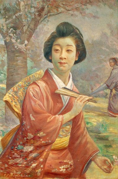 Curator: Welcome. Here we have Lilla Cabot Perry’s "Portrait of a Young Girl with an Orange," completed around 1901. A captivating painting influenced by Japonisme and the Impressionist movement. Editor: There's a subtle quality here. The girl's gaze is directed towards the viewer, but at the same time she looks away from the viewer as if distracted. It’s this quiet moment that arrests the eye, like seeing someone caught in thought. The colours feel organic and textured. Curator: Perry spent a significant time in Japan, becoming deeply immersed in Japanese aesthetics and artistic conventions. This painting is one example, with the incorporation of a kimono and bamboo motifs behind the young girl as Japonisme exploded into public consciousness. These Japanese visual cues provided an entryway for a white American artist to display familiarity with Asian artistic styles while safely positioning herself within acceptable Orientalist frames. Editor: I find myself wondering about the materials she used. Those subdued colours would come from particular pigments and ground minerals and were available commercially. There is almost a tension created by the materiality of Japanese signifiers through paint, and its function to commodify Japonisme for the Western consumer. Curator: Absolutely, we can also view it as part of the broader artistic and social trend, where Japanese art and culture were influencing Western artists seeking new forms of expression at the dawn of the 20th century. Editor: Right, thinking about the oil paint itself - a relatively new material at the time in terms of its mass production - it has a role in creating a bridge between social class and cultural values. The painting becomes less about the girl or orange, but more about how those Japanese images are converted into marketable material through process and presentation. Curator: Perry skillfully blends Western painting techniques with Japanese sensibilities. She navigates the tricky currents of cultural exchange prevalent at the time, making this piece culturally valuable beyond its sheer aesthetic beauty. Editor: Exactly! Considering the commodification and consumption, the cultural context is crucial. Thanks for guiding us to a better understanding of these social factors! Curator: It's my pleasure. It's paintings like this, that invite viewers to ponder how the currents of history and identity intertwine within art. Editor: Indeed, reflecting on these layers definitely changes the viewing experience and reveals so much more about its production than initially apparent.