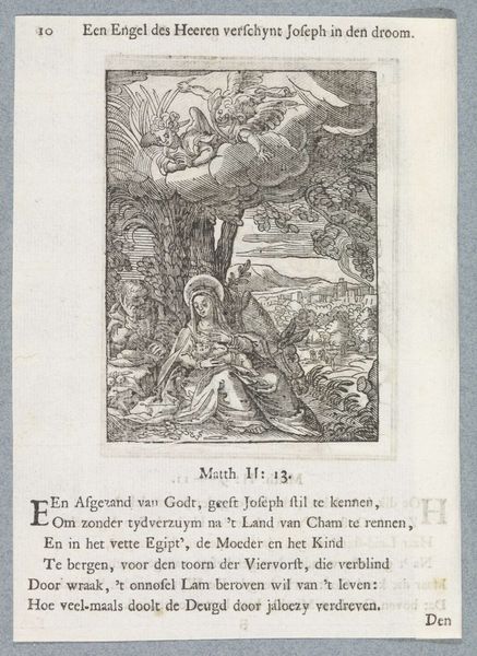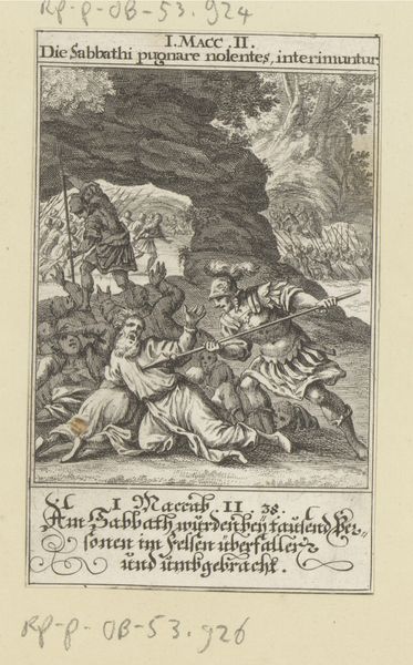 Curator: We’re looking at "The Death of Absalom," an engraving dating roughly from 1645 to 1740. It is currently held at the Rijksmuseum. Editor: The starkness of the black and white really emphasizes the tragedy unfolding. It's quite a violent image, made all the more disturbing by the detail crammed into such a small space. Curator: Indeed. The artist, Christoffel van Sichem II, vividly depicts the biblical story of Absalom's demise. Note how Absalom, suspended by his hair in the oak tree, becomes a visual metaphor for the consequences of ambition and rebellion. The story in 2 Samuel underscores themes of fractured loyalty. Editor: And it is important to consider the very patriarchal, almost feudal power dynamic at play in the history painting itself. His act of rebellion is viewed, obviously, within the constraints of loyalty and hierarchy—yet the act itself reads like an inevitable conclusion to generations of power struggles and abuse. What symbols, or compositional strategies point to that reading, to you? Curator: Well, the positioning of the figures—Absalom hanging vulnerably while Joab and his men are poised with spears—certainly emphasizes the brutal assertion of power. The oak itself carries layers of meaning. While trees in art are often symbolic of nature or refuge, here, the oak becomes an instrument of divine justice, ensnaring Absalom and leading to his downfall. Also, the sharp angles and lines certainly evoke the story's harsh conclusion. Editor: It is difficult for me to overlook how the engraver's deliberate use of linear composition also emphasizes the role of power—all that visual rigidity that evokes, for me, very deliberate patriarchal oppression, as though everything here should return to a predestined status quo. And so often this is how the oppressed end up. In the end. Stuck between tree limbs. Curator: And perhaps within that act of rebellion and divine retribution, it exposes the fragility of a patriarchal order, destined to constantly self-destruct… Editor: Leaving us only with tragic portraits and the bare branches of symbolic oak trees. Curator: Food for thought.