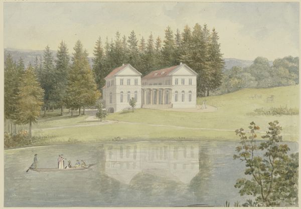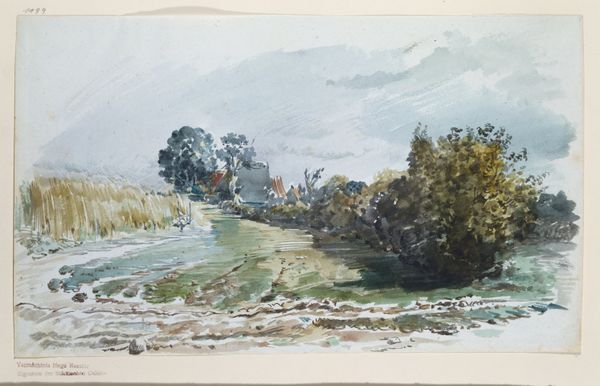 Curator: This delicate watercolor before us is titled "Hrabušice," painted in 1891 by Jozef Hanula. Editor: My first impression is one of serenity, but also a certain… coolness. The predominantly green and gray palette creates a rather tranquil but slightly melancholic mood. Curator: Hanula, a master of plein-air painting, certainly captures the atmosphere of the Slovakian countryside. The way he's used the watercolor medium to depict the light is really striking. Consider the muted reflections on the water’s surface. How do you see its significance relating to nature? Editor: The absence of people is palpable; to me, this highlights the tension between humans and nature. It encourages a look at how land ownership and societal needs, viewed through critical lenses, impacted landscape painting as an artistic practice and its relevance. Curator: Interesting. Considering this piece was painted in the late 19th century, one can certainly view it through the lens of the emerging environmental movements and anxieties regarding industrialization that shaped landscape representation. This is not a heroic representation; it shows more domesticity with touches of impressionism. Editor: Absolutely. There's something powerful in that quietude. The almost photorealistic rendering of the architecture in comparison to the more abstract rendering of foliage reflects an acknowledgment that landscape itself becomes, especially for working classes, less something enjoyed and more an owned and operated property. Curator: Indeed. This brings forth another layer. These works not only reflect what's happening at that time, but they reflect issues that still are happening and invite us to have conversation with it through history, gender, race, and class differences. Editor: Thinking of intersectional elements helps to consider access, environmental rights, and ecological responsibility and how the landscape plays as inspiration in various cultures to find resistance. Well, thank you, this has given me so much food for thought about this little watercolor! Curator: And to me. Art really is a product of a historical moment, open to continual reinterpretation through evolving societal understandings.