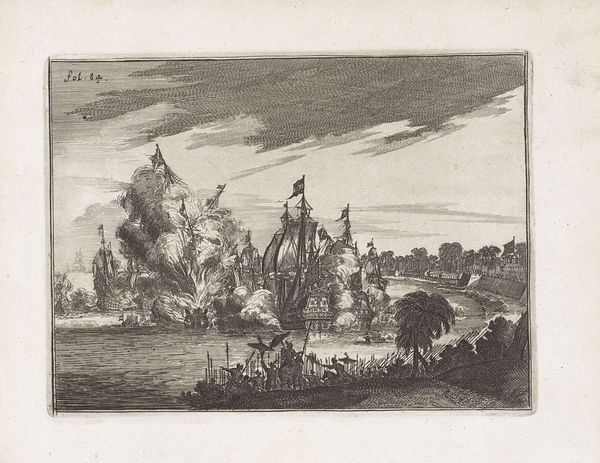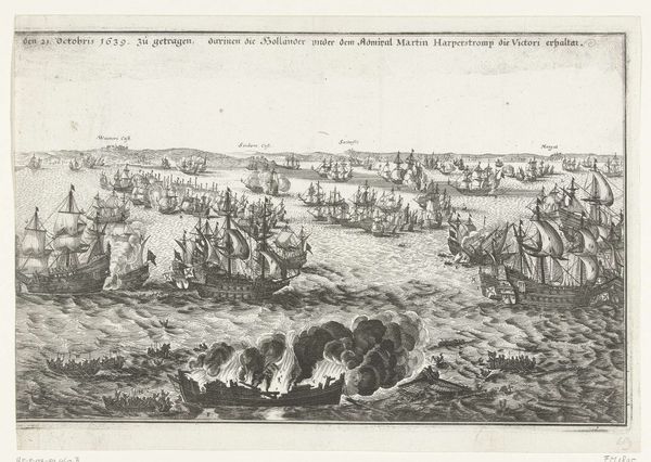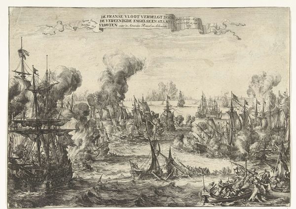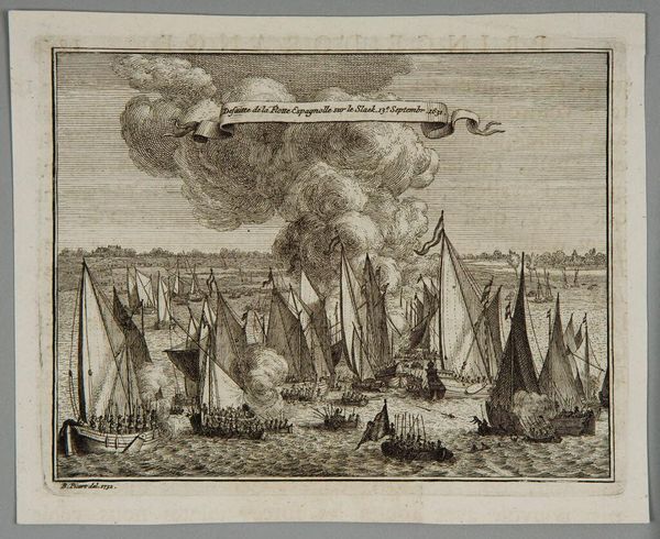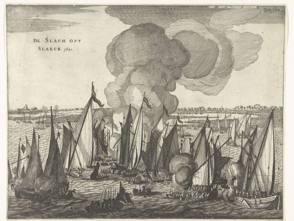 Editor: This etching and engraving is entitled “Slag op het Slaak, 1631”, or “Battle on the Slaak”, made in 1732. I am immediately struck by the intricate linework and the dynamic composition. There’s a palpable sense of chaotic energy, even in monochrome. How do you interpret this piece through its formal qualities? Curator: The dynamic arrangement is certainly a critical point of entry. Notice how the artist uses contrasting lines, dark versus light, to create a sense of depth and movement. Consider the meticulous depiction of the ships, their sails creating sharp angles against the softer, billowing smoke. Does the tension generated by this contrast suggest something to you? Editor: I suppose it adds to the drama. It's like the hard-edged ships are pushing back against the formless smoke, implying the struggle of battle. It is quite theatrical, fitting with Baroque sensibilities. What’s interesting, though, is that despite the apparent detail, the figures are rather undifferentiated. Curator: Precisely. The individual figures are subsumed within the larger compositional structure. They contribute to the overall texture and rhythm rather than functioning as distinct individuals. This echoes Baroque artistic principles, prioritizing grand gestures and spectacle over intimate portrayals. Notice how this contrasts with, say, the Renaissance focus on the individual human form. Are you starting to see how the form and the supposed content are linked? Editor: Absolutely! The artist prioritizes the overall visual impact – the battle itself, and this overwhelming scene – rather than any particular person in the fray. It's not just a depiction of the event, but a Baroque interpretation of conflict through line, texture and shape. Curator: Exactly. Form truly dictates content.