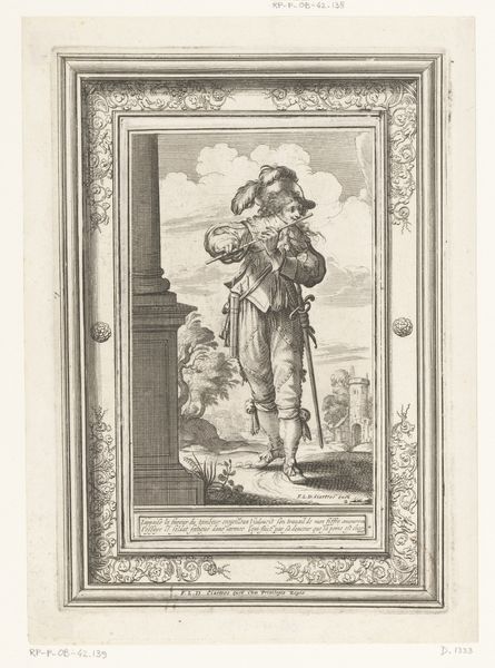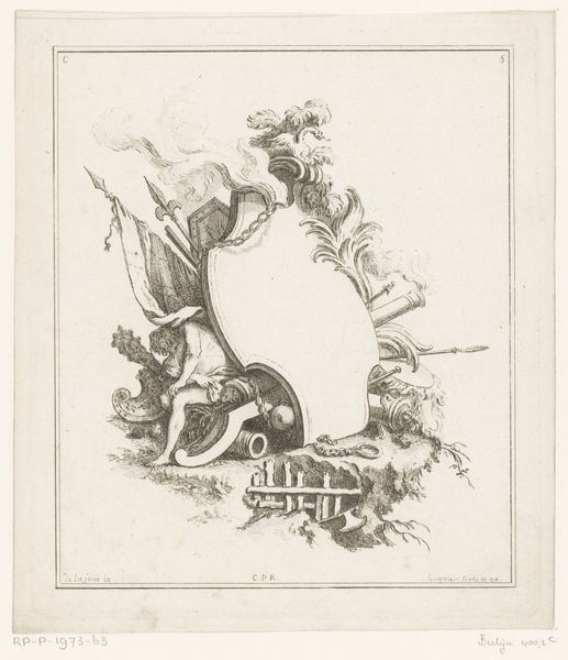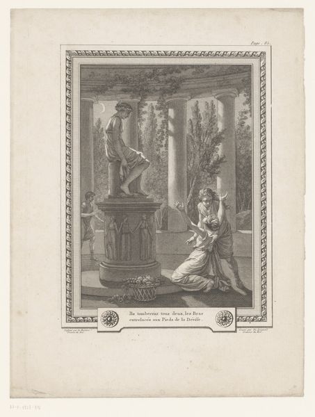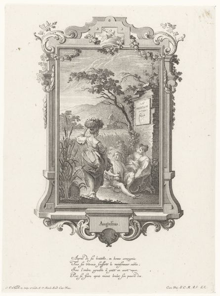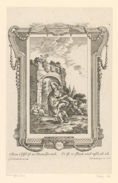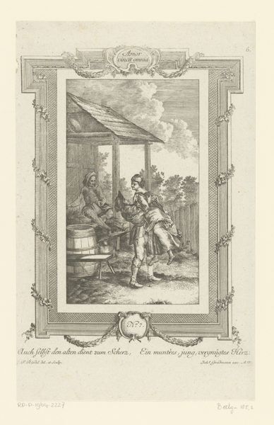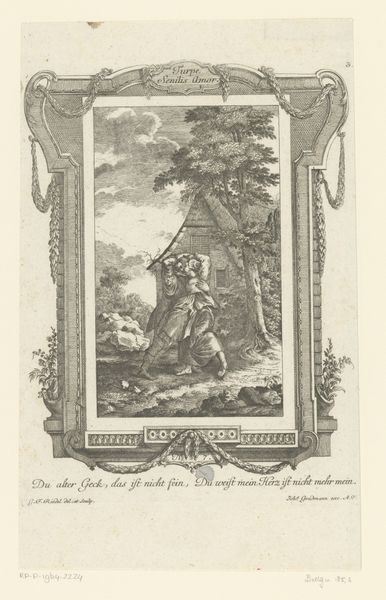 Curator: What a lively image! We are looking at an engraving titled "Verliefd stel dansend," which roughly translates to "Loving Couple Dancing." It was created by Gottlieb Friedrich Riedel sometime between 1778 and 1779. Editor: It immediately strikes me as joyous, yet perhaps a bit chaotic. The couple at the center seems caught in a whirlwind, a very physical, even clumsy embrace. Curator: Clumsy maybe isn't the word I would use. Riedel’s work emerges in an era increasingly fascinated by sentimentality and dramatic representations of everyday life. We're on the cusp of Romanticism, where personal feeling is key, and you certainly see that with the movement. Editor: It makes you wonder, who are these people? And why are they embracing in such a manner outside this quaint house, while someone observes them from the doorway? The presence of a third party also introduces this tension of how we represent love, affection, and intimacy as a staged image versus lived reality. Curator: Precisely! Think about the culture that produced and consumed it. Genre scenes like this were immensely popular among the rising middle class. They depict relatable situations, celebrating domesticity, virtue, and sentimental bonds. There are actually some words inscribed in German on the piece, "Haissa! Lustig, froh bin ich, Meine Frautel liebet mich!," basically "Haissa! Happy and cheerful I am, my darling loves me!" Editor: Given that context, it feels less chaotic now. The framing, though formal, contrasts nicely with the unbridled emotion within the scene. I keep wondering, though, is the embrace mutual or more forced than romantic? Curator: I can see that reading, especially in the light of later ideas around power dynamics and the construction of gender roles. But I would offer it also might have just reflected different notions of public intimacy, and representations of the family sphere, during this period. It's an artwork, I would argue, about seeing the representation and cultural values associated with these ideas in society at this moment in time. Editor: That really shifts the perspective and opens up even more interpretation. Thank you for highlighting these cultural and historical frameworks to really give context to that otherwise simple-seeming expression of "loving couple dancing" in 1770s. Curator: Of course. Analyzing such imagery not only sheds light on Riedel's work but it also gives a window into the social and cultural landscape of the era in which it was created and perceived.