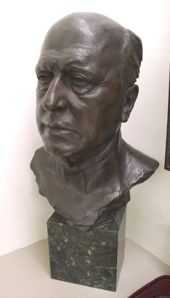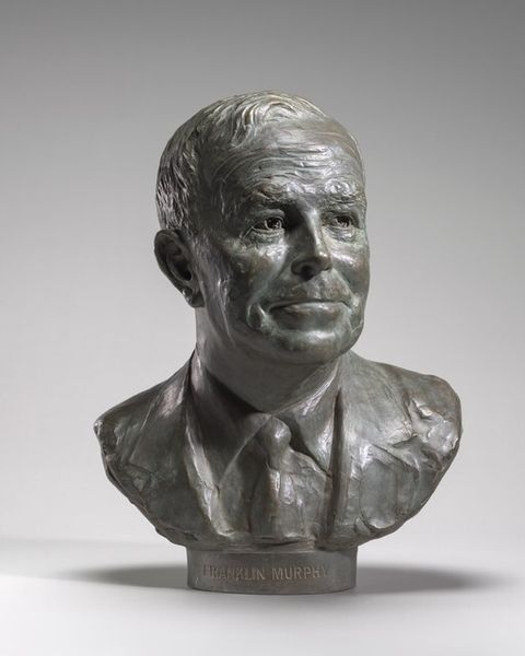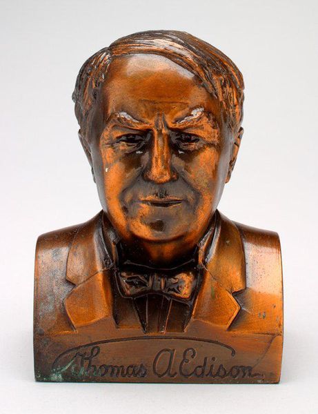 This little Roosevelt bust, probably made of cast metal around the mid-20th century, has a kind of earnestness about it. The maker, Kenton Hardware, wasn’t trying to trick you with virtuoso detail, but you sense they put their back into it. There’s a directness in the approach that’s appealing. The surface is a kind of bronzy color, but it's mottled, like an old penny that’s been kicking around a while. The texture isn’t smooth; you can see the marks and pits, like the traces of its making are still visible. It reminds me of those busts and statues you see in old libraries – a bit worn but still full of presence. Look at the way the light catches the ridge of the brow and the set of his jaw. Those little details tell a story. It's like seeing the past through a slightly blurry lens. It brings Marsden Hartley to mind, with that same feeling of homespun and no-nonsense American modernism. Ultimately, it's more about the touch and feel than historical accuracy.