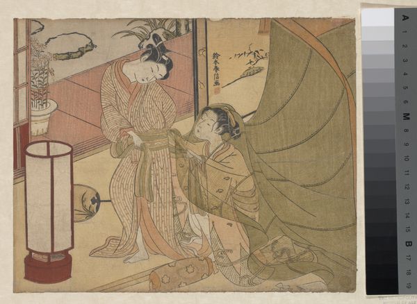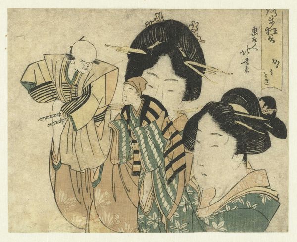 Kitagawa Utamaro created this woodblock print, "Young Man Smoking with a Courtesan," during the Edo period in Japan, a time marked by economic growth and the flourishing of arts and culture. The print captures a moment of intimacy between a young man and a courtesan, reflecting the era's complex social dynamics and gender roles. Utamaro, known for his portraits of women, presents the courtesan not merely as an object of desire but as an individual with her own presence. The young man, in turn, is depicted in a moment of leisure, highlighting the cultural practices and social rituals of the time. Utamaro's work often navigated the blurred lines between the floating world of pleasure and the deeper currents of human emotion. In "Young Man Smoking with a Courtesan," we glimpse the delicate balance between societal expectations and personal desires, a theme that resonates across centuries. It asks us to reflect on the historical conditions of intimacy, gender, and class.