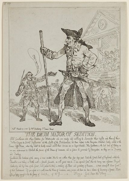 Editor: So, here's "The Loss of Eden, - and Eden, Lost" by Thomas Rowlandson. It looks like an etching, and it definitely has a satirical feel to it. What historical context am I missing here? Curator: This piece speaks volumes about the political climate of the late 18th century, particularly Anglo-American relations. Consider the title, a clear reference to Paradise Lost. Rowlandson is drawing a parallel between the biblical expulsion from Eden and the loss of the American colonies. How does the visual language reinforce this comparison? Editor: Well, one figure holds a paper labeled "Liberty," while the other seems to be shouting the same word. Is this about the American Revolution? Curator: Precisely. It's a commentary on the concept of liberty and how it's being used—or perhaps misused—by both sides of the conflict. Think about the phrase "every man has his price" at the top. Who profits, and at whose expense? Editor: So it's a critique of both British and American motivations? Curator: Exactly! It suggests that the pursuit of liberty can be tainted by self-interest and political maneuvering. What do you make of the composition? Editor: I see... It's less about ideals and more about power dynamics. Thanks, that helps a lot! Curator: Indeed. By understanding these nuances, we can appreciate the complex layers of meaning embedded in Rowlandson's work.