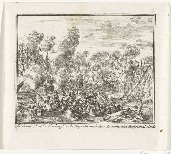 Bernard Picart created this print, "Franse wreedheden in Bodegraven en Zwammerdam in 1672," with etching. The linear quality emphasizes the chaotic and brutal nature of the scene. Notice how Picart uses dense clusters of figures in the foreground to draw us into the devastation. Buildings ablaze in the background rise as smoky columns, structuring the scene with a visual depiction of destruction. This contrast between detailed foreground and the fiery backdrop serves to intensify the emotional impact. Here, the artist isn't just documenting an event but also engaging in a form of visual rhetoric. Through composition and line, he directs our eyes to the devastation, inviting us to interpret the cultural and political narratives embedded within the scene. This interplay between form and content challenges any passive understanding of history, urging us to question the power dynamics represented. The artwork functions as both a historical record and a powerful commentary on the atrocities of war.