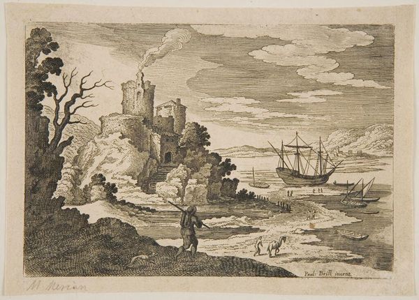 Editor: Here we have Giampiccoli's "Harbour," a black and white print from the 18th century. I'm struck by the contrast between the serene landscape and the bustling activity near the shore. What do you see in this piece? Curator: For me, it's about the dance between decay and life. The crumbling tower juxtaposed with the lively harbor suggests a world in constant flux. A reminder that even in ruin, there's a strange, beautiful sort of progress. Doesn't it feel that way to you? Editor: It really does. There's a sense of constant movement, even in the stillness. Curator: Exactly. Maybe it's a mirror to our own journeys – embracing the chaos, finding beauty in the imperfect. Editor: Thank you, I hadn’t thought of it that way before.