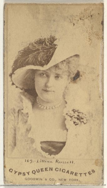 Editor: Here we have an albumen print from sometime between 1885 and 1891. It's an image of L. Vaughn from the Actors and Actresses series by Allen & Ginter for Virginia Brights Cigarettes. It's striking how this small photograph was used for commercial purposes. What are your thoughts on this piece? Curator: Well, let's start with the obvious: this is not just a portrait, it's a commodity. Allen & Ginter were essentially using Vaughn’s image to move product. The albumen print, a specific photographic process popular at the time, involved coating paper with egg white to create a glossy surface for the photographic emulsion. It's interesting to consider the labour involved – the literal processing of animal products. This type of mass-produced image democratized access to portraiture but simultaneously turned artistry into a marketing strategy. Editor: So, the albumen printing process is key to understanding the piece? Curator: Absolutely. The means of production—photography paired with albumen printing—are intrinsically tied to mass consumerism and celebrity culture, even back then. The 'Actors and Actresses' series cleverly capitalizes on fame. Editor: It seems so removed from contemporary photography, being tied to something so tangible like eggs and celebrity endorsements, though. Curator: Exactly. By focusing on the materiality of the albumen print, its mass production for advertising, and the social context of using celebrity endorsements, we uncover a dialogue about labor, value, and consumption that still resonates today. This is far more than just a pretty picture of an actress. What does the overt branding reveal to you about its initial consumption? Editor: That makes a lot of sense. It’s really a study in how fame and product can be mutually constructed. I hadn’t considered the implications of the materials themselves before. Curator: Indeed! It challenges the idea of the artwork as solely an aesthetic object and asks us to consider it as a material product embedded in social and economic networks. Editor: Thanks! I'll never look at a trading card the same way again!