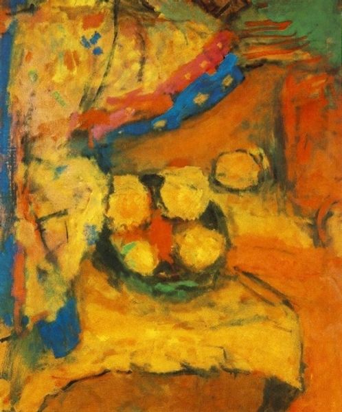 Curator: Welcome. We’re standing before “Czóbel Béla Kancsó,” an oil painting with an impasto technique attributed to Béla Czóbel. Editor: It feels immediately visceral. Earthy tones, oranges and browns predominantly, with bold textures that really bring forward the materiality of the oil paint. It is heavy with feeling. Curator: Indeed. Czóbel’s manipulation of oil paint lends itself to considering his process. Notice the palpable sense of movement suggested by the strokes of the pallet knife—almost chaotic, even though depicting domestic subject matter, ostensibly. What’s your take on the symbolism here? Editor: Well, the 'kancsó', that central pitcher, can often be seen as a vessel. Considering the era, one can read into its cultural significance to be perhaps about domesticity, sustenance or tradition. The vibrant blue splash in the upper corner almost seems to suggest another object...possibly? Curator: Perhaps. And to broaden that scope a little bit, thinking about that domestic subject matter, its creation speaks to the broader access to resources Czóbel experienced. This reflects shifts in artistic patronage at the time, impacting not just who was making art, but what subjects they chose to depict. Editor: True. And within the historical context, a still life like this speaks quietly about the everyday while indirectly alluding to universal, ongoing human experiences. Curator: I agree, considering the artist’s choice of impasto with oil paint. The sheer amount of paint and the labor involved signal something significant. The medium enhances the tactile aspect and adds another layer of meaning. It’s not merely representing a vessel but emphasizing the act and process of depiction. Editor: It certainly draws attention to its status as an object in itself. Ultimately, the piece is complex. It’s grounded, referencing fundamental objects while simultaneously, I think, managing to be uplifting. Curator: A keen assessment, I feel. Reflecting on “Czóbel Béla Kancsó,” the way Czóbel worked with readily available resources prompts a reimagining of material production—which reveals profound dimensions related to access, labor, and intention. Editor: Absolutely. From the vessel's symbolism to the artist's application, there’s definitely an emphasis on historical relevance within something as deceptively "simple" as a still life. Thanks for elaborating.