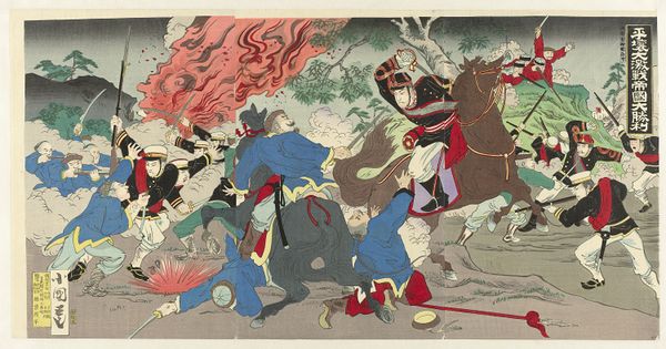 This woodblock print by Yosai Nobukazu depicts the Sino-Japanese War, specifically the Battle of Fenghuangcheng. It’s likely from 1894 or 1895, given that’s when the war took place. The print offers insight into the cultural and political climate of Meiji-era Japan. Here, we see the glorification of military prowess, a common theme in Japanese art of the period. Japan was actively engaged in nation-building and asserting itself on the world stage. Woodblock prints like this served as propaganda, bolstering public support for the war effort. The choice to depict the battle heroically, with emphasis on the bravery and skill of the Japanese generals, reveals the artist’s and the patron’s desire to shape public opinion. These prints were widely circulated, contributing to the construction of a national identity rooted in military strength and imperial ambition. Understanding the socio-political context is essential. We can consult historical archives, newspapers, and government documents to understand better how these images were used and what impact they had on Japanese society at the time.
