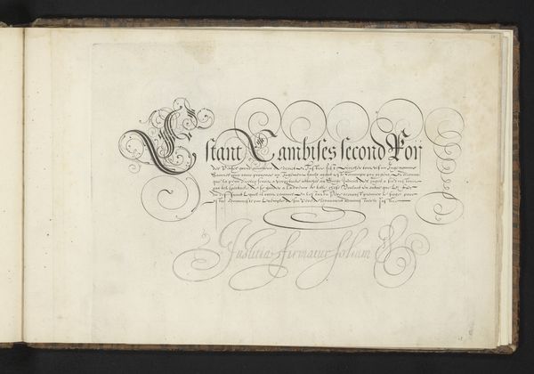 Editor: Here we have "Schrijfvoorbeeld: Raphael d' Urbin (...)" made around 1605 by Cornelis Dircksz. Boissens. It’s an ink drawing on paper, a striking example of Mannerist calligraphy. The delicate lines and swirling forms create an intricate pattern. What can you tell me about the materials and process used to create such a work? Curator: Examining this piece through a materialist lens allows us to consider calligraphy not just as an art form, but as a skilled craft situated within a specific social context. The paper itself, likely handmade, would have been a valuable commodity. The ink, too, comprised of carefully selected materials. Think about the labour involved, from the production of paper and ink to the years of training needed to achieve such mastery of penmanship. This isn’t simply about aesthetics; it's about the material conditions of artistic production. Editor: So, it’s less about the subject of the writing and more about how it was physically created and its value as a commodity? Curator: Precisely! The graceful lines aren’t just beautiful; they represent the skill, time, and material resources invested in the work. Consider how calligraphy was employed: in legal documents, official correspondence, and, of course, art. The consumption of such skill reflected and reinforced existing social hierarchies. This piece exemplifies how artistry can be inseparable from the socioeconomic realities of its time. Editor: That's fascinating! I had only thought of it as decorative. I appreciate how this shifts my perception to consider labor, materials, and the economic aspects. Curator: Exactly, seeing art through this lens reveals hidden connections between aesthetic beauty, material value, and social structures.
