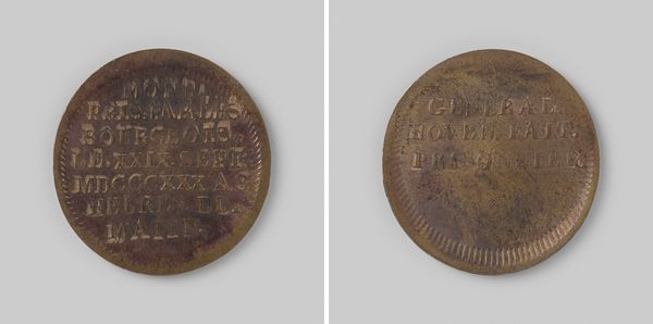 This copper medal commemorates the twelve-and-a-half-year wedding anniversary of W.A.A. Poelman and H.S. Alewijn. The design features inscriptions framed by circular elements, one side with a wreath, the other with sans-serif block lettering. The circular form, employed on both sides, serves to unify the disparate elements of text and image. The wreath, a classical motif, signifies honor and celebration, encapsulating the essence of the marital milestone. Conversely, the text presents an economy of form, typical of commemorative medals. The interplay between image and text is a fascinating study in semiotics; while the wreath evokes a sense of timeless tradition, the text grounds the medal in a specific time and place, creating a tension between the universal and the particular. In this regard, the medal functions as a cultural artifact, embodying both personal sentiment and societal norms.