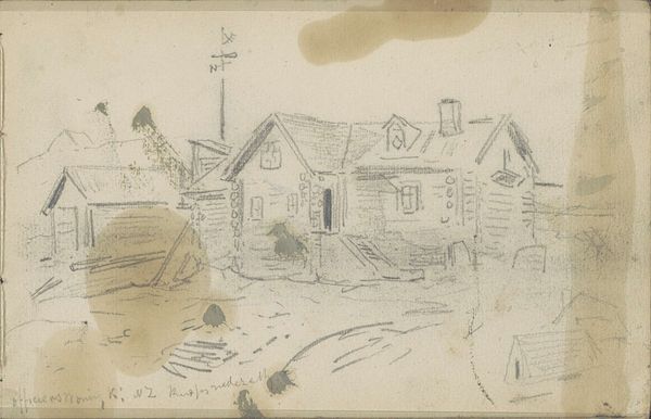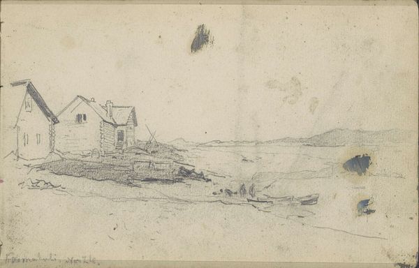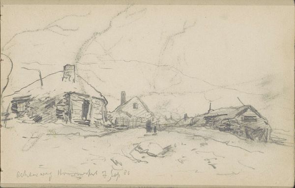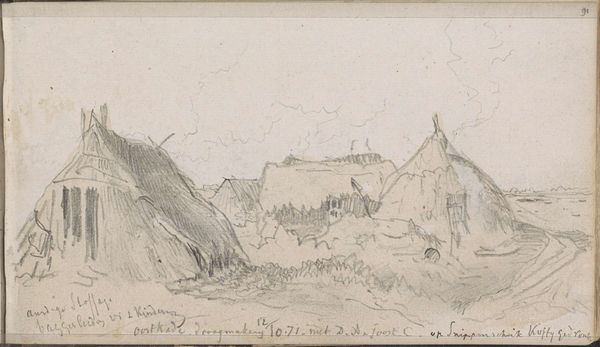 Curator: Look at this unassuming pencil sketch! It’s titled "Gezicht op het Russische station te Malye Karmakuly, Nova Zembla," or "View of the Russian station at Malye Karmakuly, Novaya Zemlya" by Louis Apol, from 1880. It is currently held in the collection of the Rijksmuseum. What’s your first reaction? Editor: Sparse! And isolated. Those faint pencil lines suggest a place that feels truly on the edge of the world. You immediately sense a chilling quietness. Curator: Apol captures that isolated atmosphere beautifully, doesn’t he? There’s a definite symbolic language at play here too. That stark cross... the rudimentary buildings… what stories might they hold? Editor: Well, crosses often speak to faith and perseverance in harsh conditions. I notice how the artist paired it with two poles nearby, the symbolism feels doubled in a way, almost emphasizing the necessity of shelter. And then the buildings… they seem incredibly vulnerable against that wide, empty landscape. A metaphor for the fragility of human existence, maybe? Curator: It's certainly possible to read it that way, and yet Apol avoids sentimentality. It's a study, not a grand statement. Perhaps the slight sketchiness speaks to this too? We get just enough information. He might just be laying down an idea to explore at length in the studio later. The eye can travel, wander the page in a way it doesn’t do with a polished piece. Editor: Exactly! It invites our projection, our filling-in of the blanks. Those jagged rock formations in the foreground mirror the implied harshness of the weather and amplify the solemn religious symbols on display. Are those rocks protecting the station? Or merely indifferent? Curator: That’s the question, isn’t it? This sketch gives so little and, therefore, allows us to come to so many conclusions! What looks like nothing much is so rich. I'll look at Louis Apol's oeuvre from a slightly different perspective after this conversation! Editor: It does feel remarkably pregnant with possibilities, for sure. That single, sketchy figure near the cross really emphasizes our own isolation while considering this lonely landscape. Thank you, Louis, for this window into the remote and unknown.