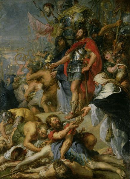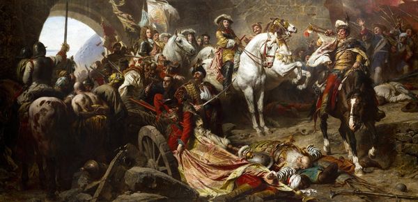 Giovanni Battista Tiepolo made this dramatic painting on canvas, using oil paints and brushes. The artist applied thin layers of pigments suspended in oil, resulting in a rich and luminous surface. Tiepolo skillfully manipulates paint to depict the chaos of battle. He employs dynamic brushwork and contrasting colors to capture the energy and movement of the scene. The materiality of the paint enhances the visual impact. The textures and tones vividly portray the clash of bodies, the glint of metal, and the billowing smoke. While the subject matter is grand and historical, we can consider the labor involved in its creation. Preparing the canvas, mixing the paints, and executing such a large-scale composition required significant skill and effort. Tiepolo had workshop assistants, and the very subject of battle reminds us of the human cost of conflict. By understanding the materials, processes, and social context of this painting, we can appreciate the interplay between artistic skill, historical narrative, and the realities of labor and conflict.