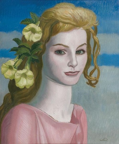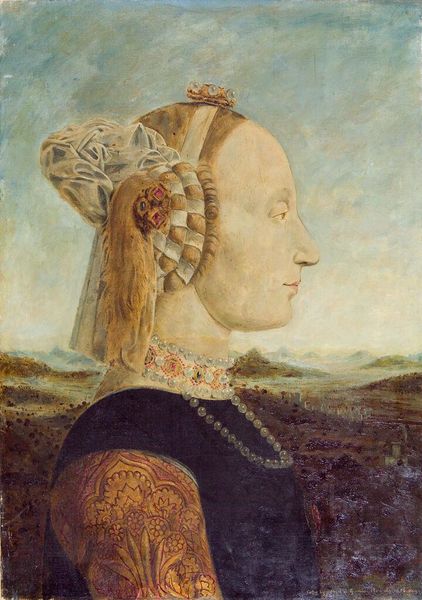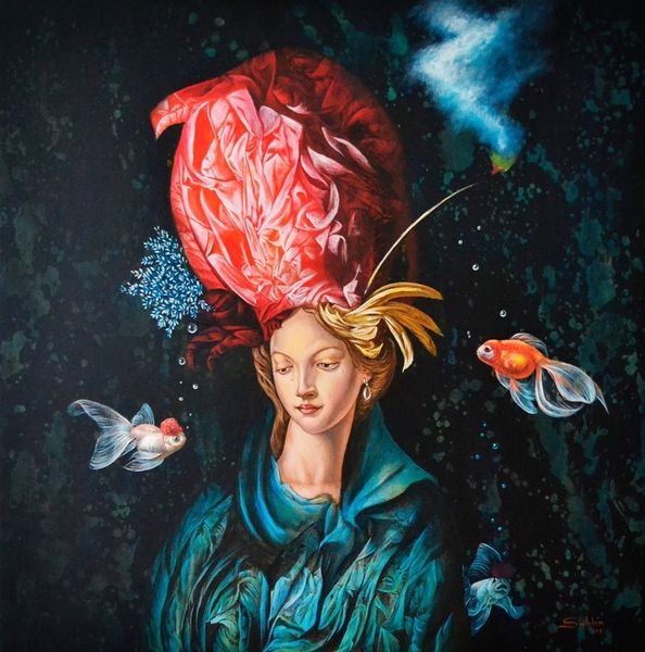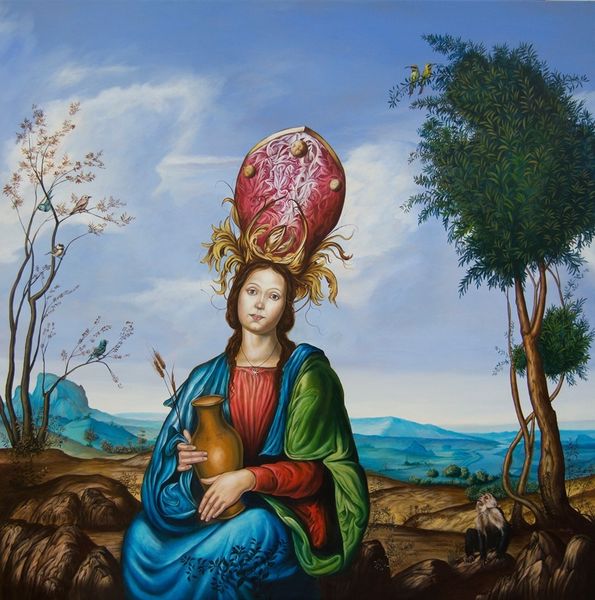 Curator: Well, this portrait by Carlos Sablón, “De la serie ‘createurs de Adamu’,” created in 2014 using oil paints, strikes me as strangely compelling. There’s an undeniable surreal quality to it. What’s your take? Editor: Immediately, the figure’s direct gaze and unusual headdress command attention. It's a curious blend of historical portraiture and surrealist fancy. It also feels somewhat dreamlike. Curator: It certainly plays with familiar historical visual language. The artist employs the composition and dress of Renaissance portraiture and juxtaposes that with surrealist elements—it becomes a kind of cultural commentary. It feels like an invitation to question fixed interpretations of the past. Editor: Absolutely, and I see many symbols at play here. That headdress is clearly referencing some kind of esoteric system. Also the figure has a strange pendant, and a puppy. Each could be its own universe of meaning, reflecting psychological or cultural traits. Curator: It’s also worth considering that surrealism, even in the 21st century, offers artists a mode to explore anxieties and question established societal norms. Perhaps the historical references heighten that feeling, a disruption of the present by invoking an altered past. Editor: I would concur. Looking at the dreamlike atmosphere of the scenery, and the burning torch at the center of the subject's headpiece makes me think that this piece speaks about knowledge and destruction, about the ability of the knowledge itself to annihilate previous knowledge. Curator: That certainly adds another layer to this fascinating work. It forces one to consider the ways in which cultural narratives are constructed and challenged, even today. Editor: Indeed. Sablón seems to use this dreamlike, historical pastiche to prod at the viewer’s subconscious, playing with collective symbols to make us wonder and think beyond immediate appearances. Curator: I'm left with the sense that there are endless cultural threads to unravel, with Sablón's fascinating work serving as a poignant focal point. Editor: A great and challenging task, really. Hopefully visitors are inspired to engage with their cultural memory in a more thoughtful manner.