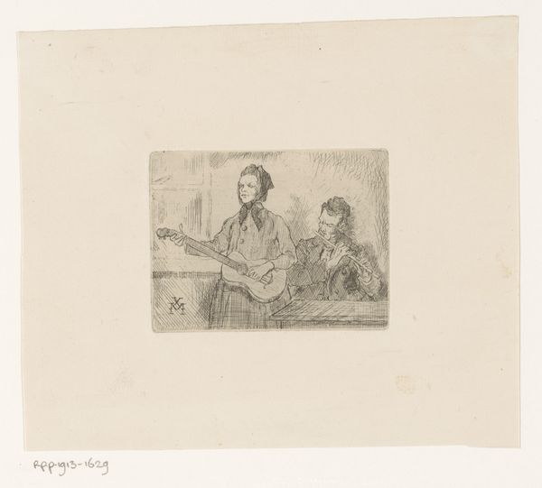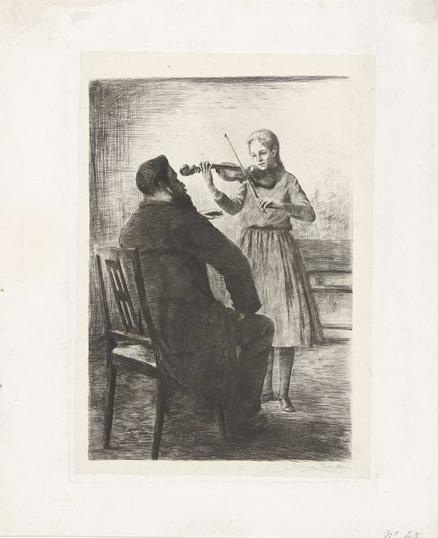 This is a print titled *Vioolspelend meisje en een man*, or *Girl Playing Violin and a Man*, made by the Dutch artist Bramine Hubrecht. The image depicts a girl playing the violin for a seated man, presumably her instructor. During the late 19th century in the Netherlands, art education was becoming more accessible, and institutions like art academies were opening their doors to women. Hubrecht herself was a student at the *Rijksacademie van beeldende kunsten* in Amsterdam. The act of portraying a music lesson is a powerful one: it comments on the changing social structures of the time, while it also portrays the intimacy and social structure that the Dutch middle-class aspired to. To better understand Hubrecht's artistic milieu, one could research exhibition catalogs, art criticism from the period, and biographical information about Hubrecht and her contemporaries. By situating art within its social and institutional context, we gain a richer understanding of its meaning and significance.